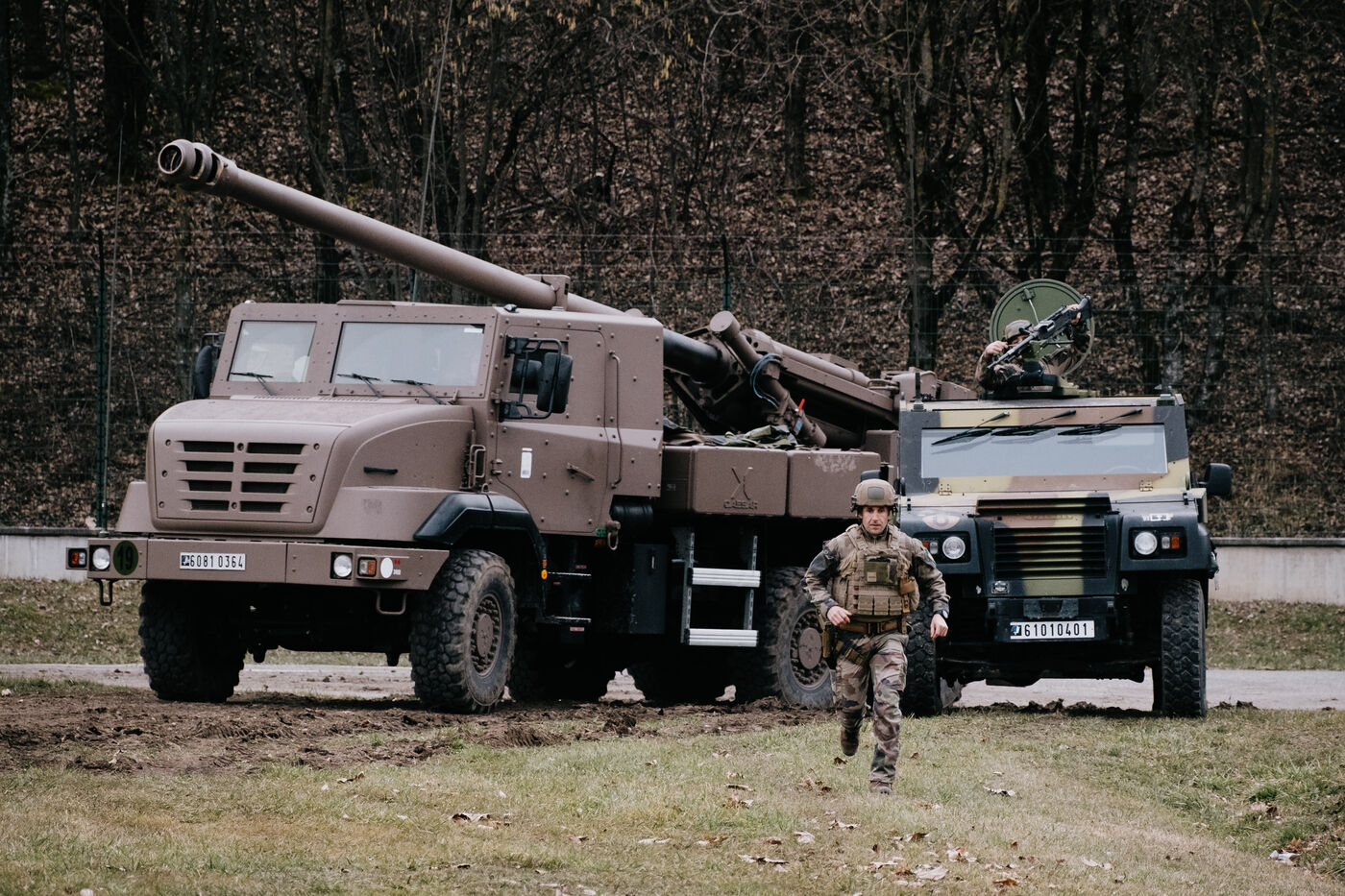 Visite de Sebastien Lecornu, ministre des armees au 93e regiment d'artillerie de montagne, qui fete ses 100 ans en 2024, en banlieue de Grenoble. Presentation des capacites d'artillerie dont des canons Caesar, dans le cadre de la formation des forces armees Ukrainiennes.