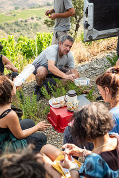 Bruno Duchêne is a passionate, independent winegrower who bought some vineyard land in 2002 from Mr Castex, an old hand in the region from whom he learned a lot by doing and listening. His vineyards are in Banyuls-sur-Mer. Bruno cultivates his vines on terraces, ploughing by hand and using a caterpillar. He leaves some of his vineyards grassed over, and sometimes cuts back the undergrowth depending on the soil's need for water. He produces natural wines and uses only 3 or 4 organic treatments a year. He is developing an economic model that involves growing his 4 hectares of vines and buying grapes from other winegrowers, which he then vinifies himself. Bruno says that you have to observe, try and adapt to the vine. He seems to be nothing more than an alchemist in the middle of his vines, dependent on the goodwill of nature.