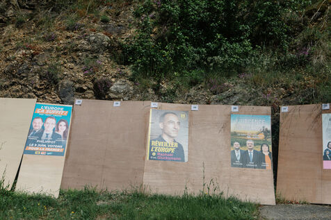 ILLUSTRATION - posters of French candidates for the European elections on June 9, 2024 on electoral billboards. Photography by Marie Julliard / Hans Lucas.
