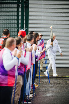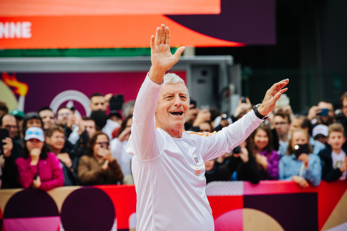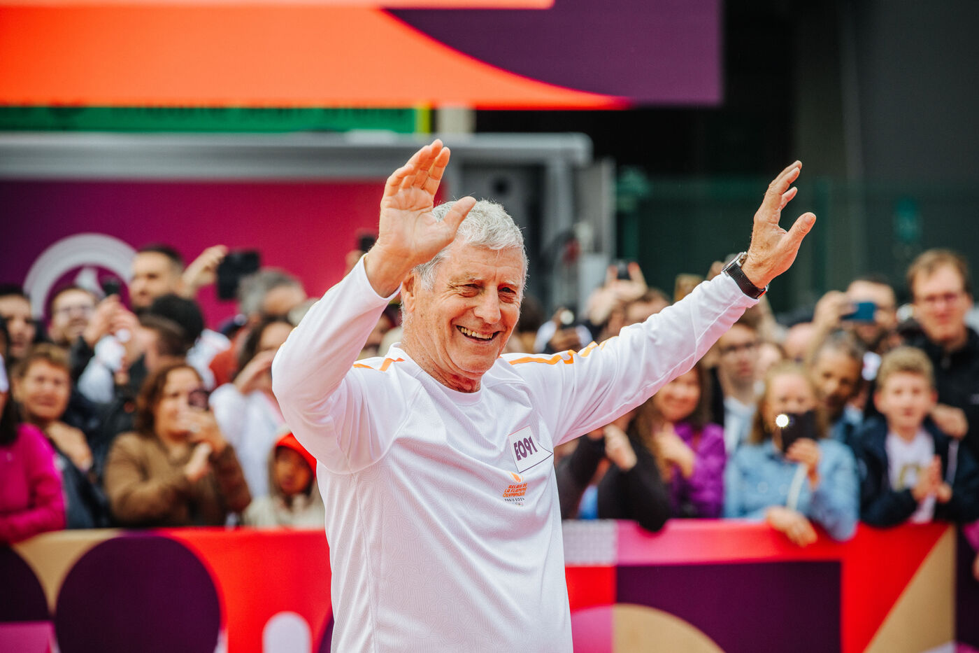 Relais de la Flamme Olympique et allumage du chaudron par Jean-Michel Larqué à Saint-Etienne
