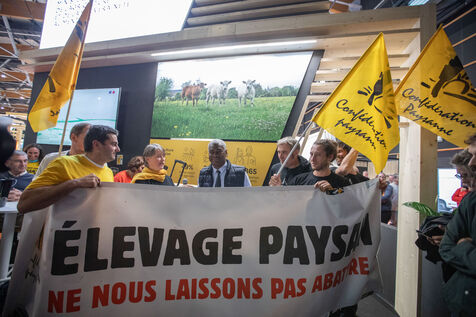 FRANCE - Cournon d’Auvergne, 02 octobre 2024, le Sommet de l’Elevage a ouvert ses portes hier à la Grande Halle d’Auvergne, près de Clermont-Ferrand, l’événement, l’un des plus grands rendez-vous européens dédiés aux professionnels, se tient jusqu’à vendredi. le préfet du Puy-de-Dôme Joël Mathurin a pris la parole lors d’une intervention spontanée de la Confédération Paysanne au sujet des maladies touchant le bétail. Egalement les remises de prix des concours de vache laitière. Photographie de Marie Julliard / Hans Lucas.
