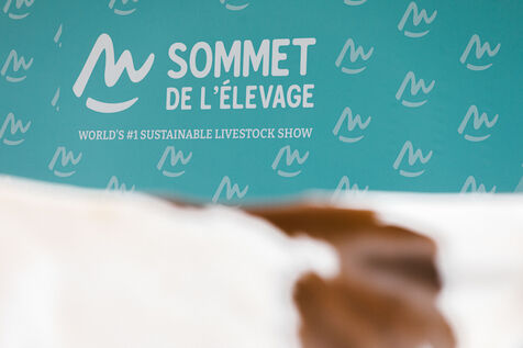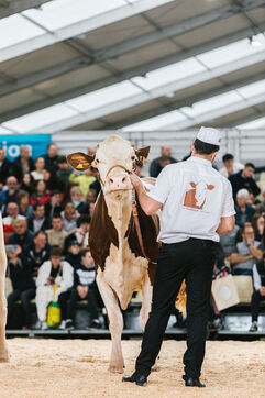 FRANCE - Cournon d’Auvergne, 02 octobre 2024, concours de bovins laitiers de race montbéliarde dans le hall 4 de la Grande Halle, au Sommet de l'élevage. Photographie de Marie Julliard / Hans Lucas.