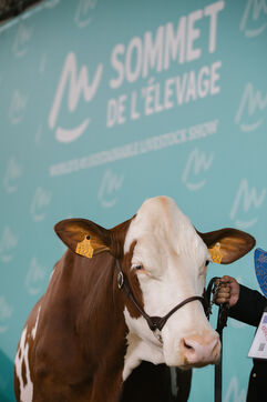 FRANCE - Cournon d'Auvergne, October 02, 2024, Montbéliarde dairy cattle show in hall 4 of the Grande Halle, at the Sommet de l'élevage. Photography by Marie Julliard / Hans Lucas.