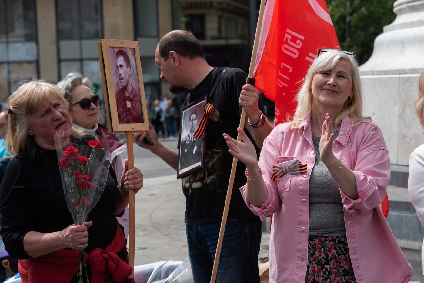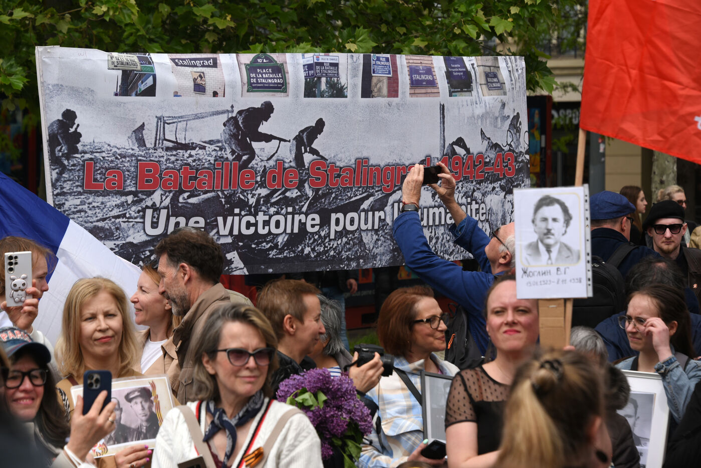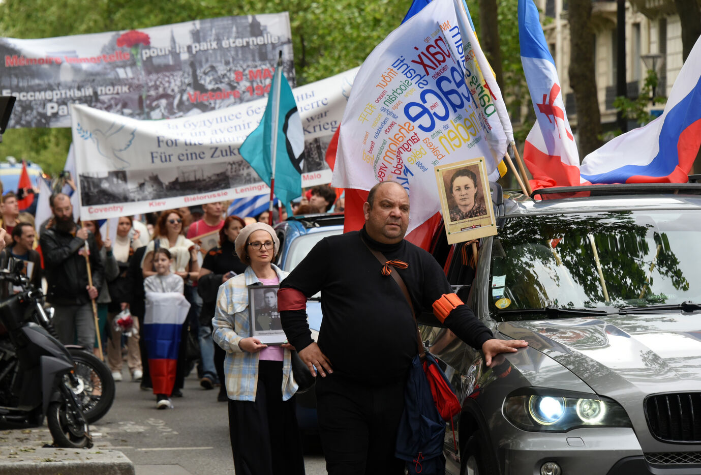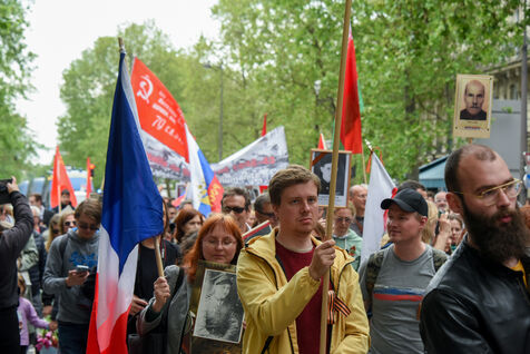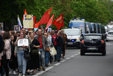 Les gens participent à la manifestation russe Régiment Immortel marquant le 78e anniversaire de la victoire sur l'Allemagne nazie pendant la Seconde Guerre mondiale (Jour de la Victoire en Europe).