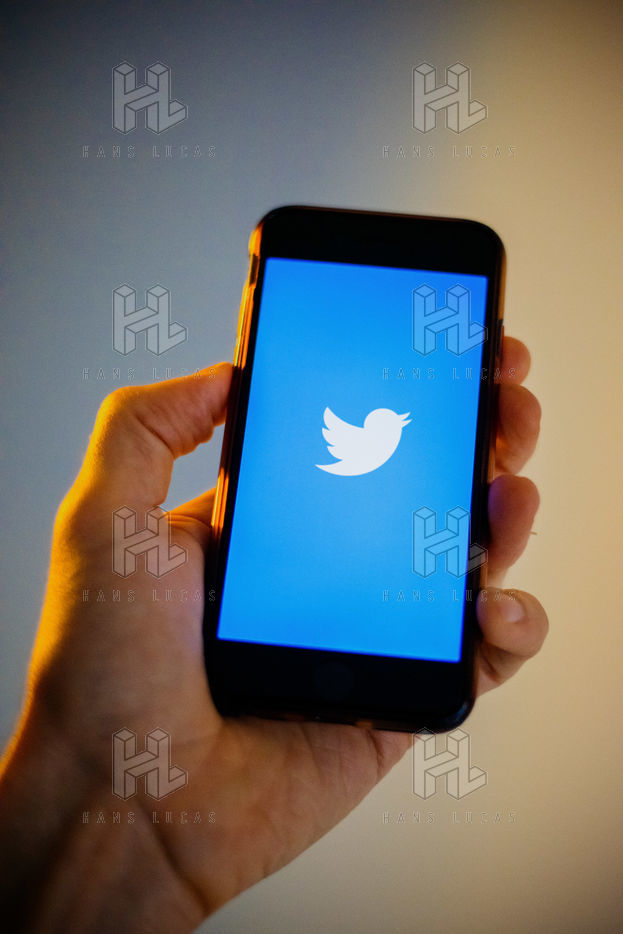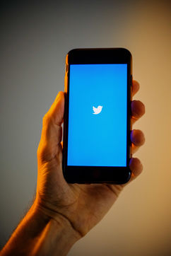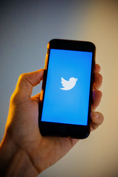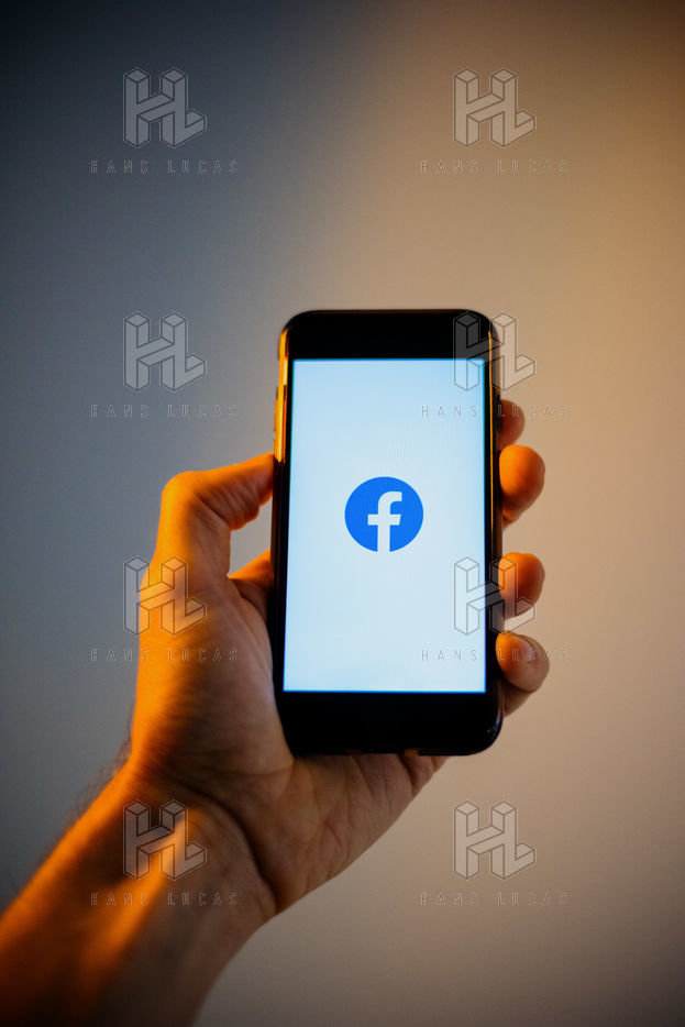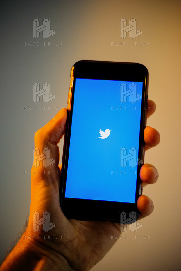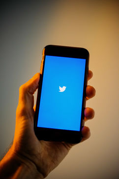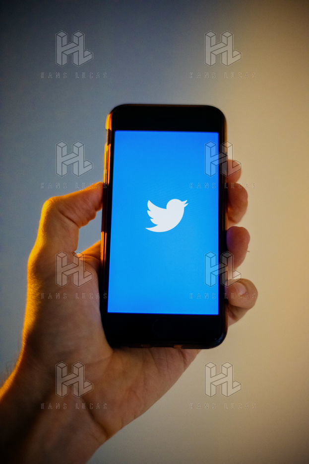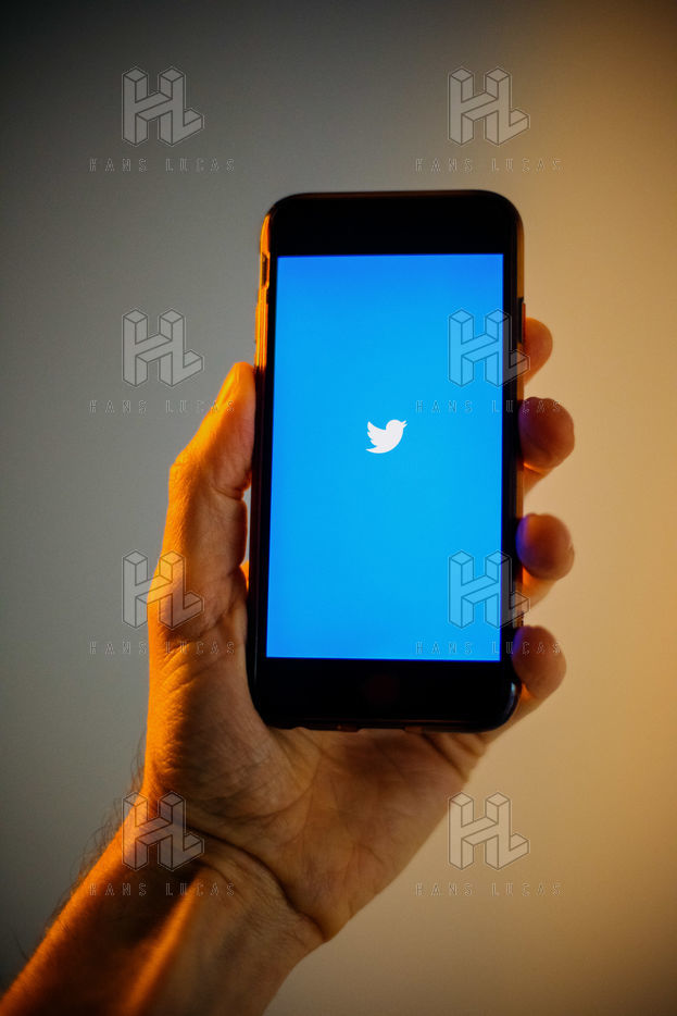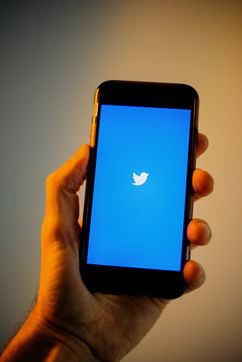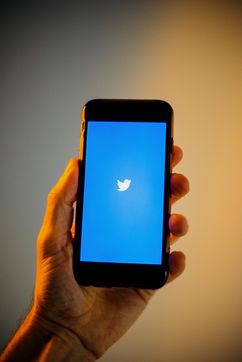 Ecrans de démarrage des applis Twitter et Facebook sur un iPhone tenu par une main et éclairés par une lumière orange