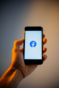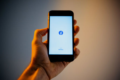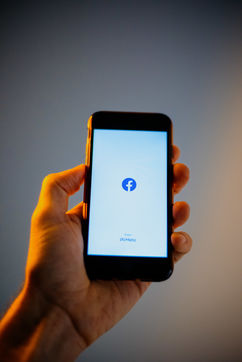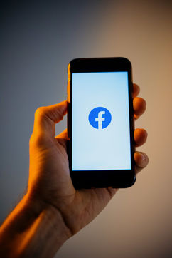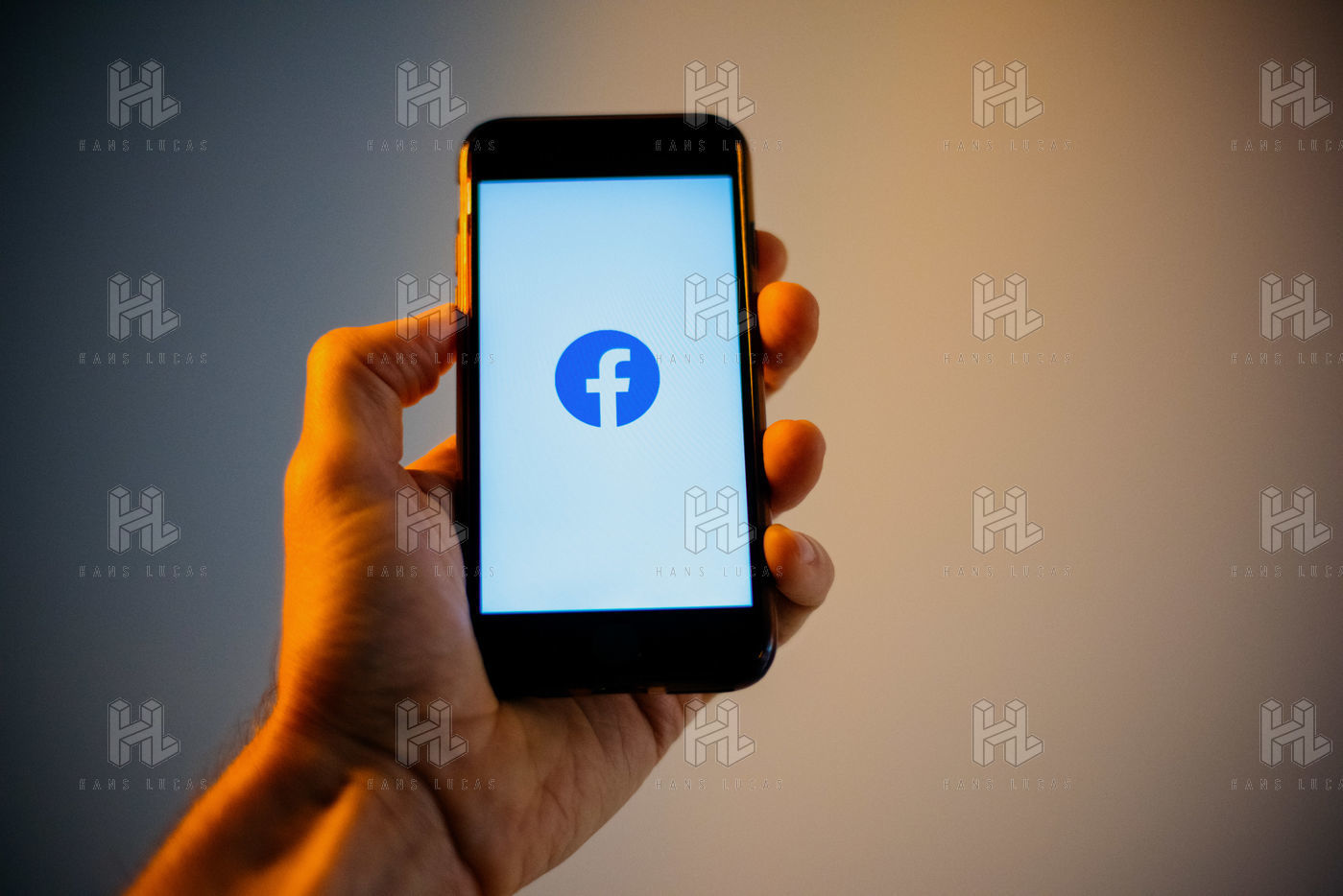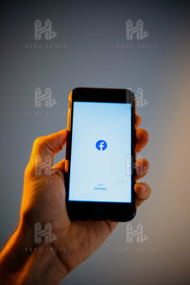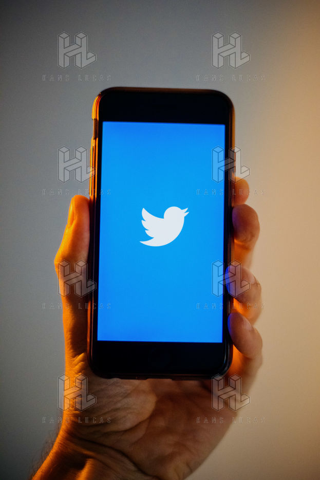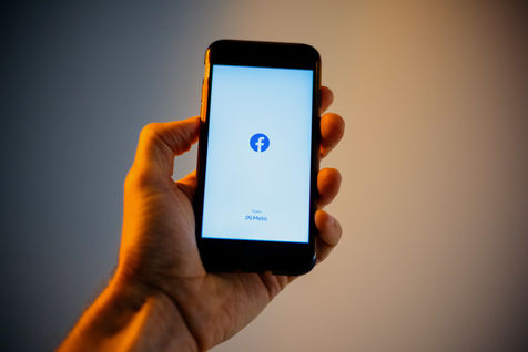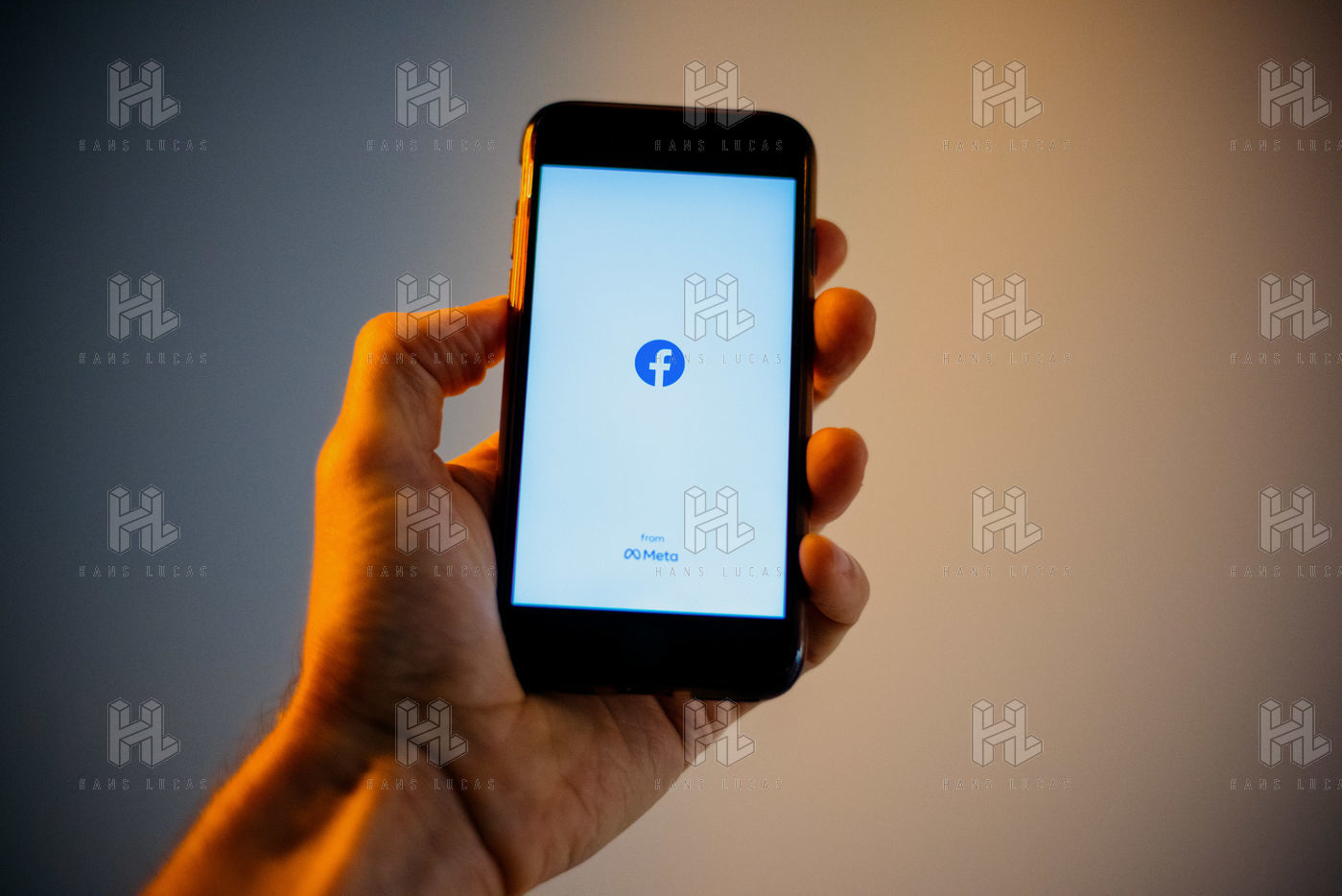 Ecrans de démarrage des applis Twitter et Facebook sur un iPhone tenu par une main et éclairés par une lumière orange