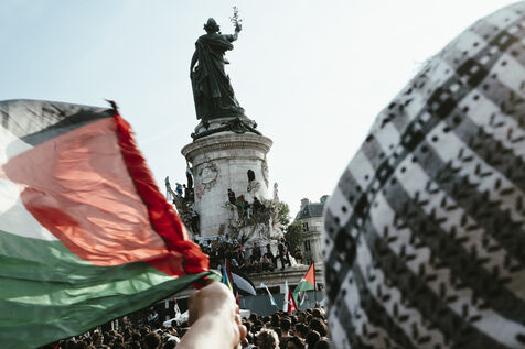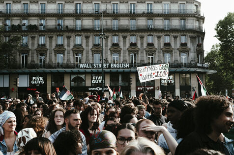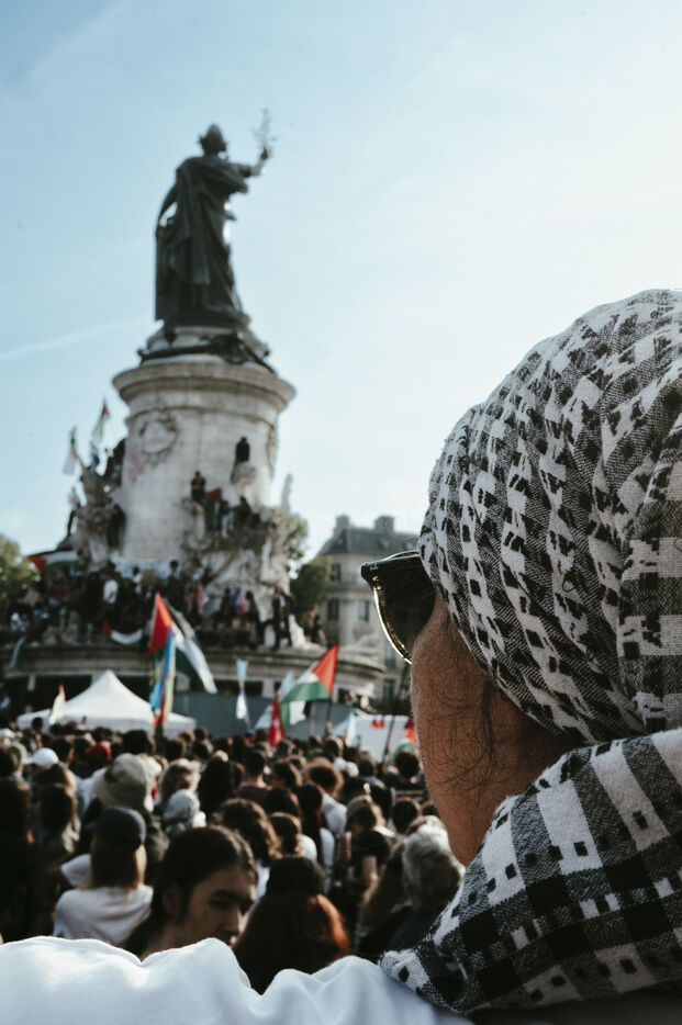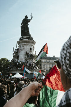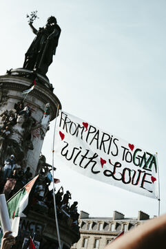 Rassemblement suite à l'arrestation des militants et journalistes et de arraisonnement de la flottille de la liberté Madleen, et en soutien au peuple de Gaza, contre le genocide en cours et pour une cessez le feu immédiat, place de la République.