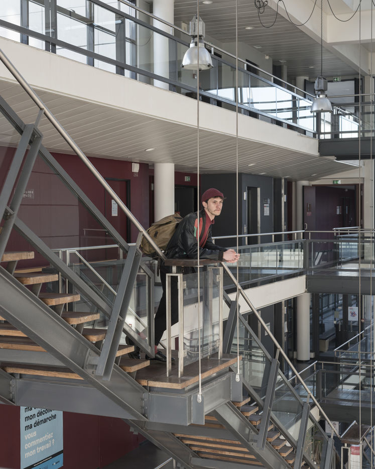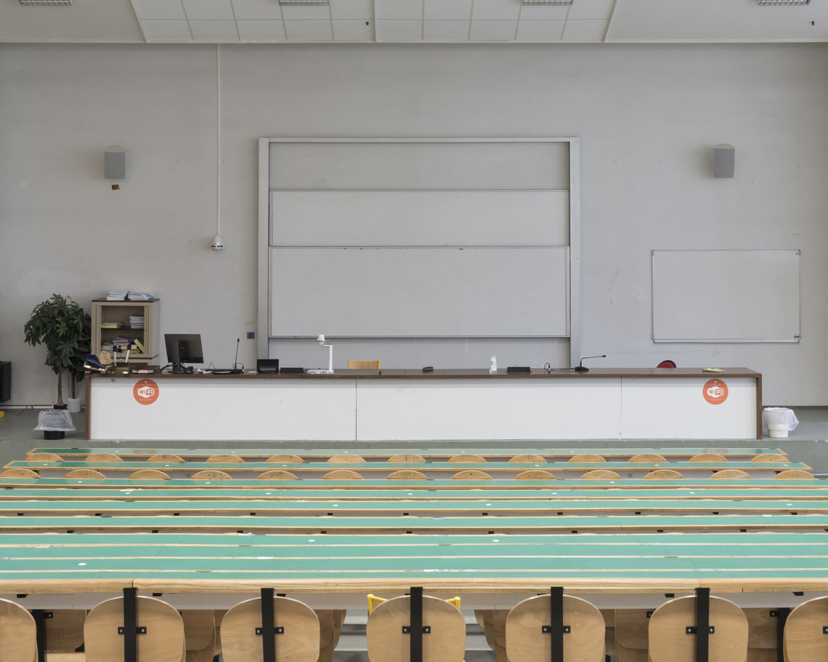 Claudine Combier, a lecturer at the University of Angers, HDR in clinical psychology and psychopathology within the CLiPsy research unit, and a speaker at the SSU (University Health Service) for students. The clearly sought-after objective was to combine the work of the laboratories, the richness of words and the thickness of images. By skilfully avoiding photojournalism or illustration, Marc Loyon has carried out a long-term project, patiently constructed and punctuated by several stays at the University. Like an anthropologist or a scientist, he began by observing, surveying the city of Angers, the campuses of St-Serge and Belle-Beille, by questioning and collecting testimonies. Later, it was the landscapes that he took hold of. Those fantasized in a period that was prevented, those so long deserted and dreamed of, to the point of approaching the most intimate territories of the rooms or student housing. Other interior views: amphitheatre, auditorium,