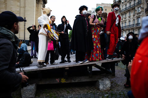 On Friday, April 12, at the call of collectives in art schools, a wild Carnival deferred in the streets of Paris to protest against the reform of the retreats. The demonstrators burst into the public space, wearing their finest manners. The time of the gathering had been two hours before.