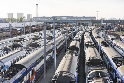 Illustration of railway tracks, trains and stations of SNCF and RATP.