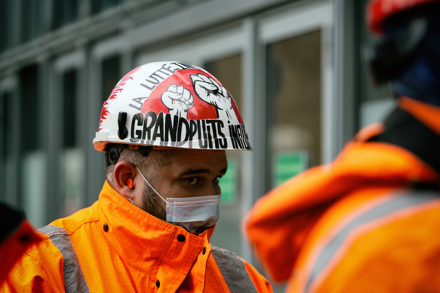 Rally of workers at the Grandpuits refinery on strike in front of Total's headquarters in La Défense.