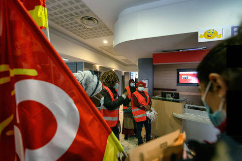 Strikers from the ibis Batignoles hotel occupy the lobby of the Ibis Paris la Defense hotel.
