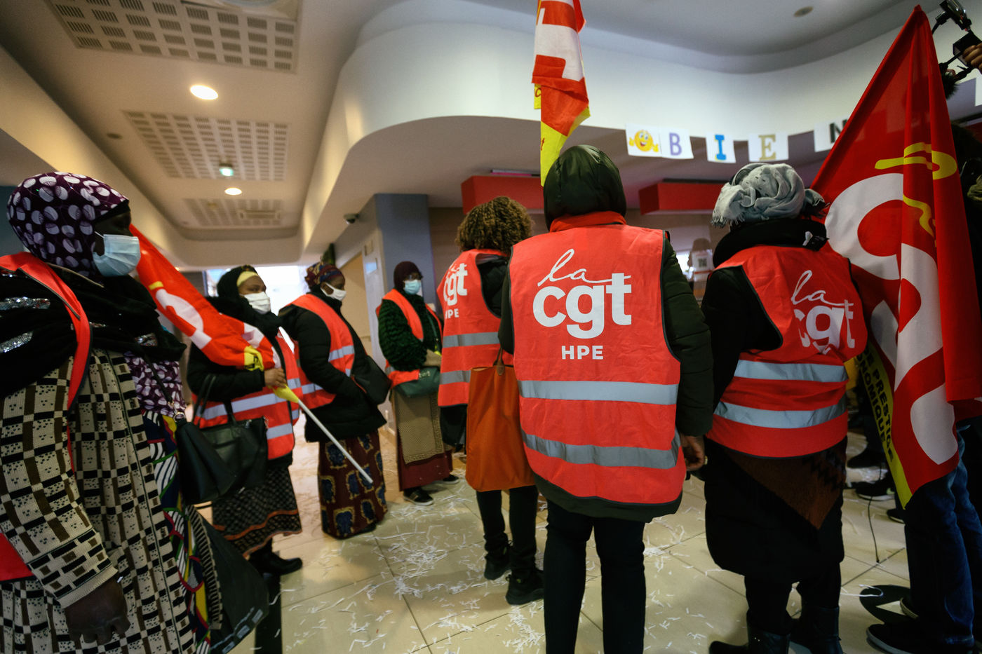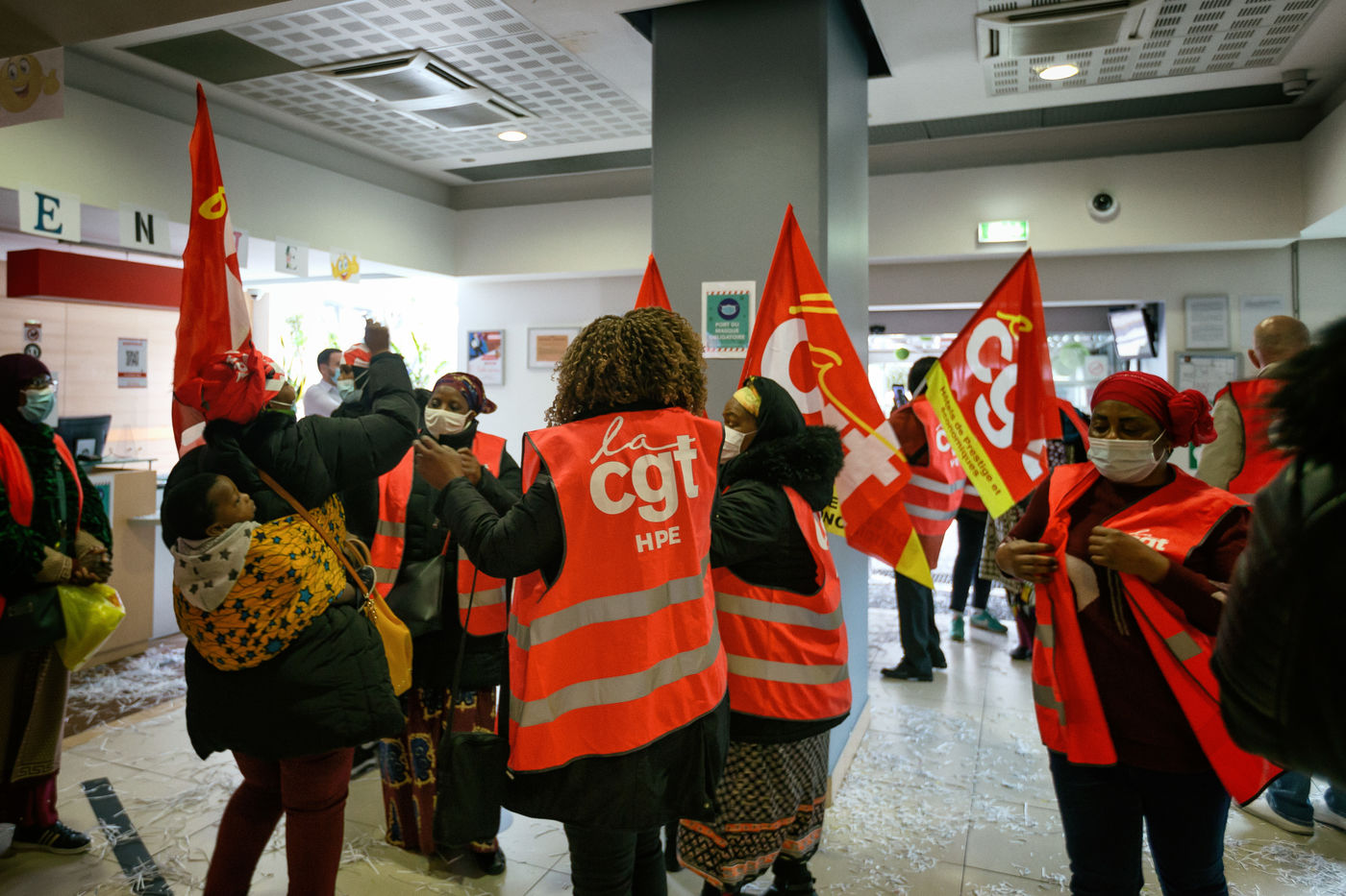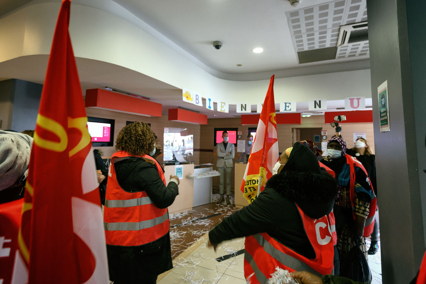 Strikers from the ibis Batignoles hotel occupy the lobby of the Ibis Paris la Defense hotel