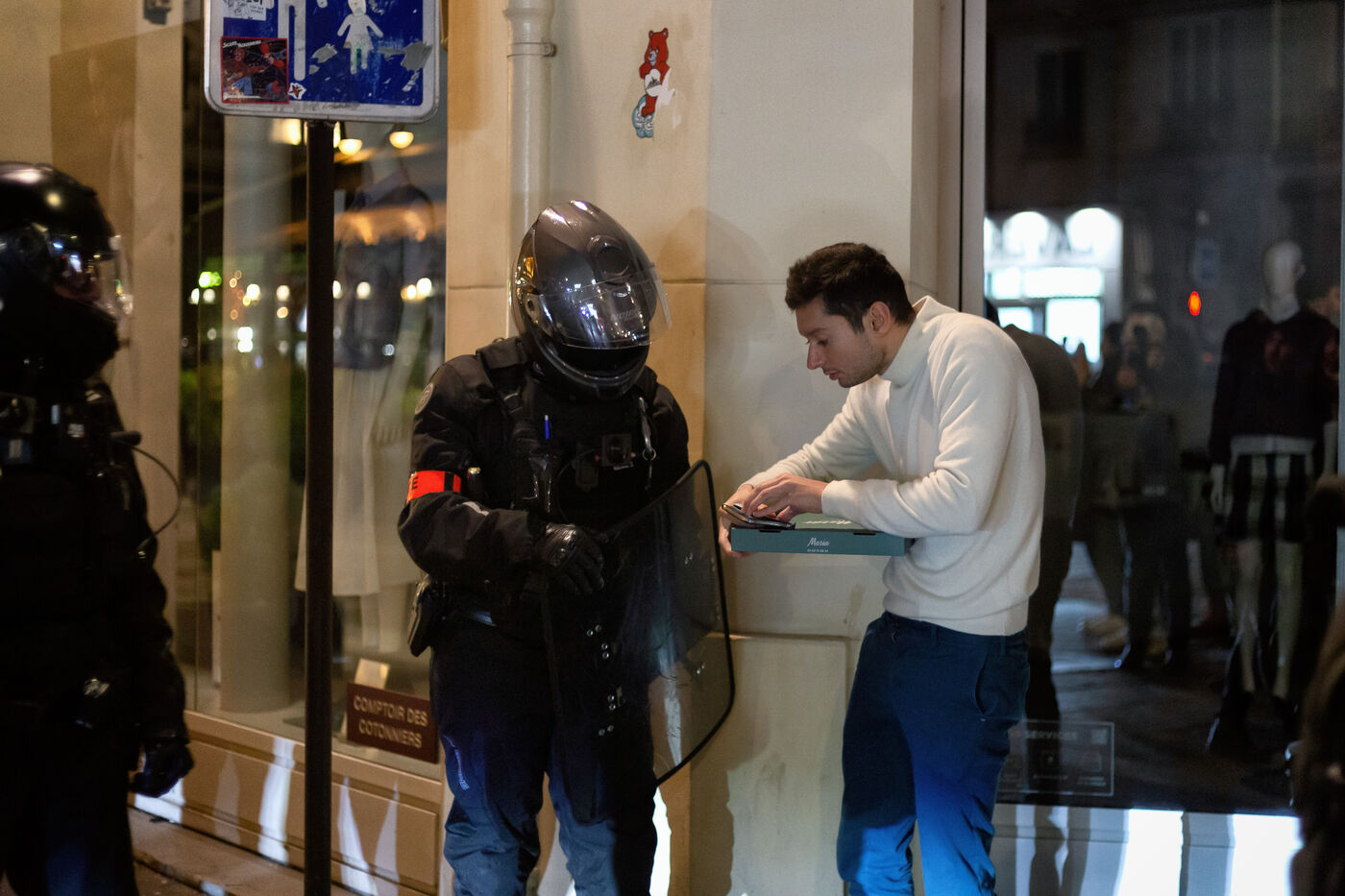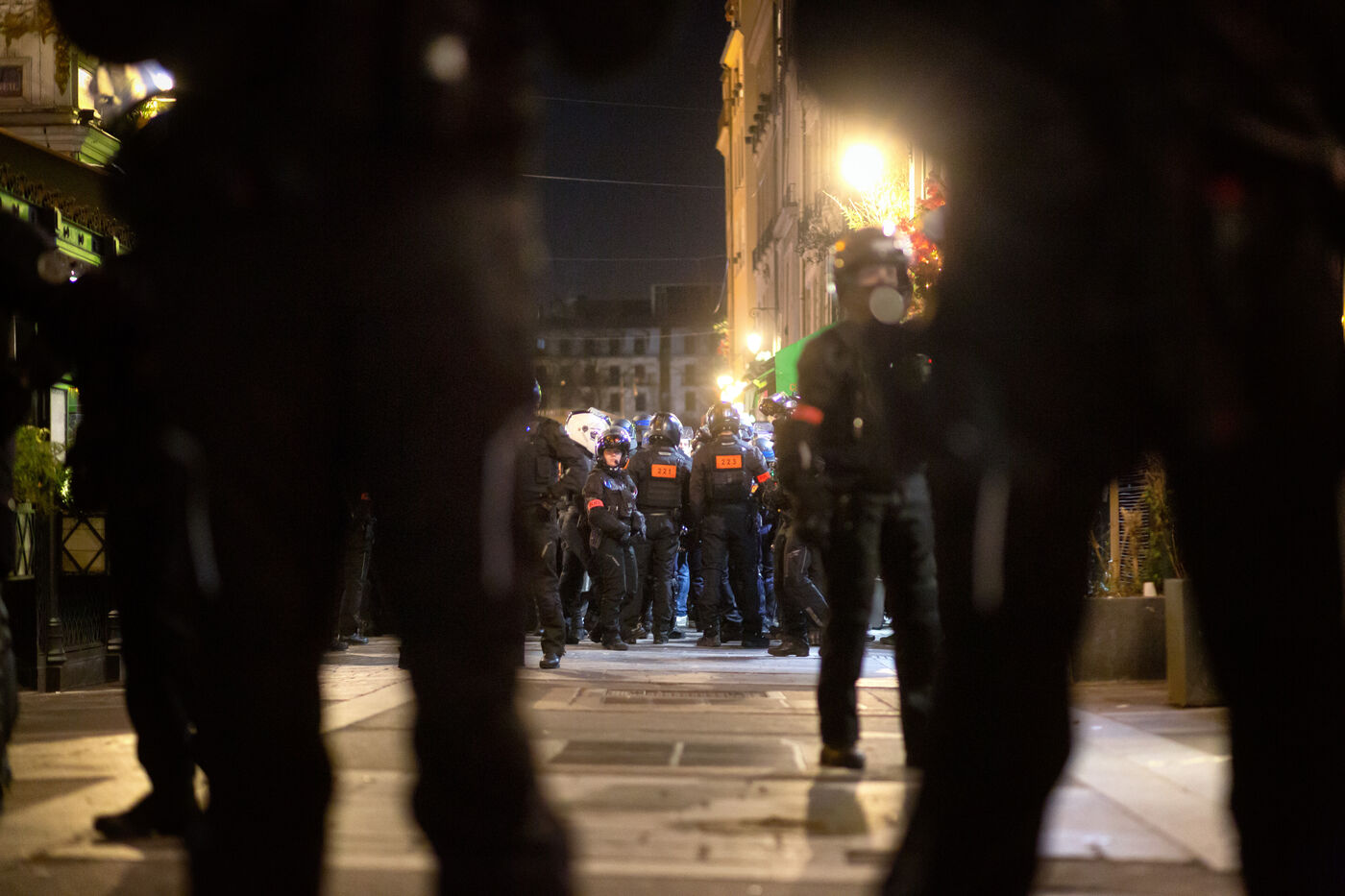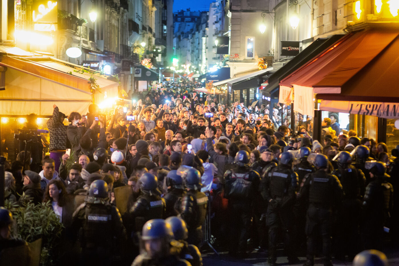 Attempted demonstration from Les Halles against the use of 49.3 and the pension reform. The police grouped and locked the demonstrators in two nests: Rue Montorgueil and Rue de Montmartre.