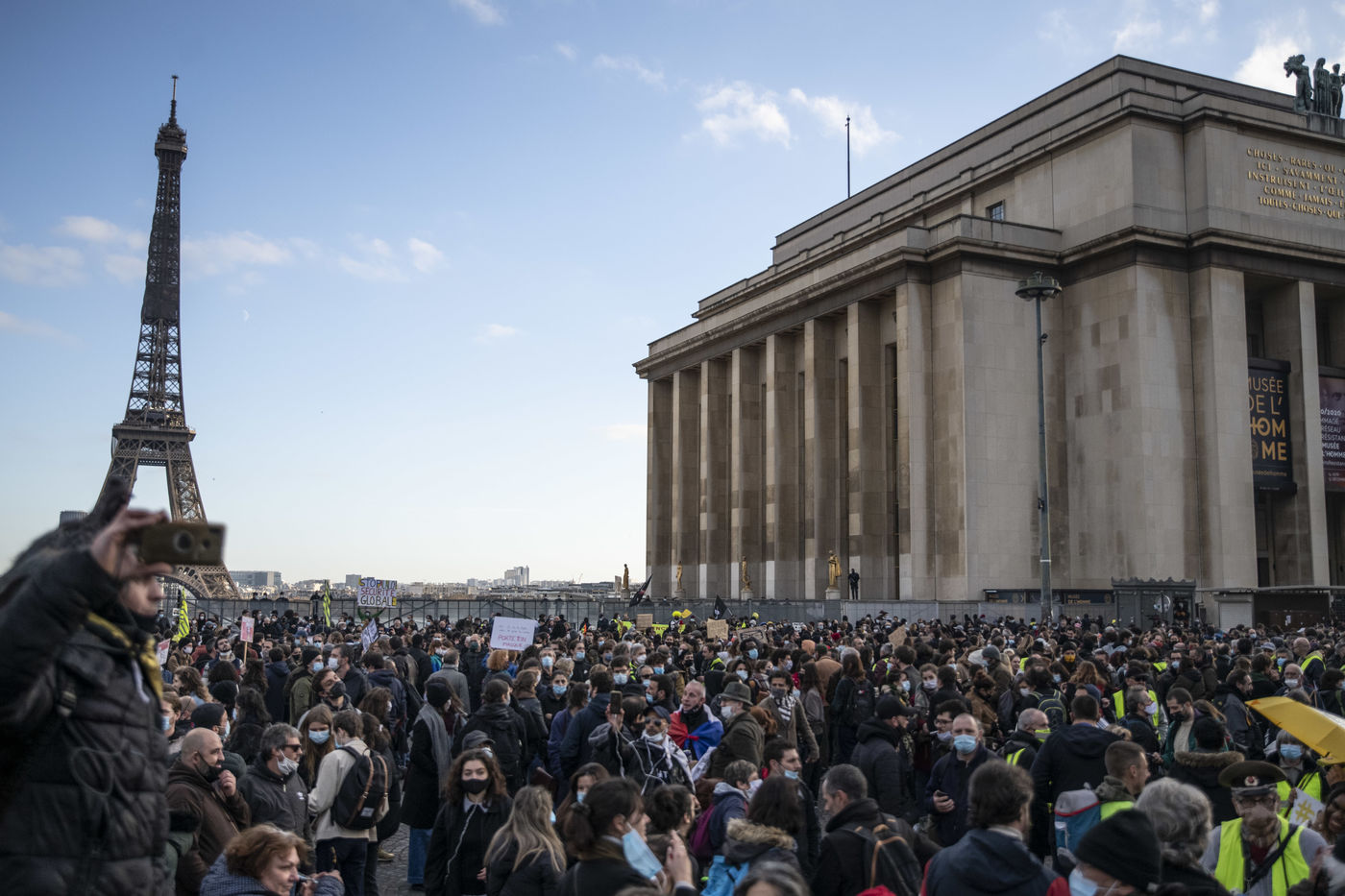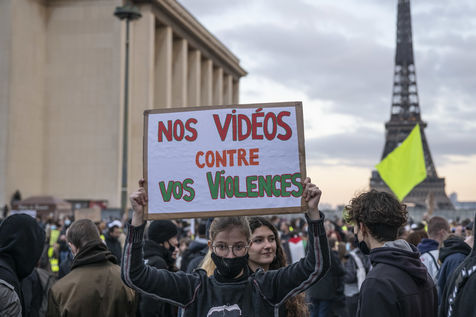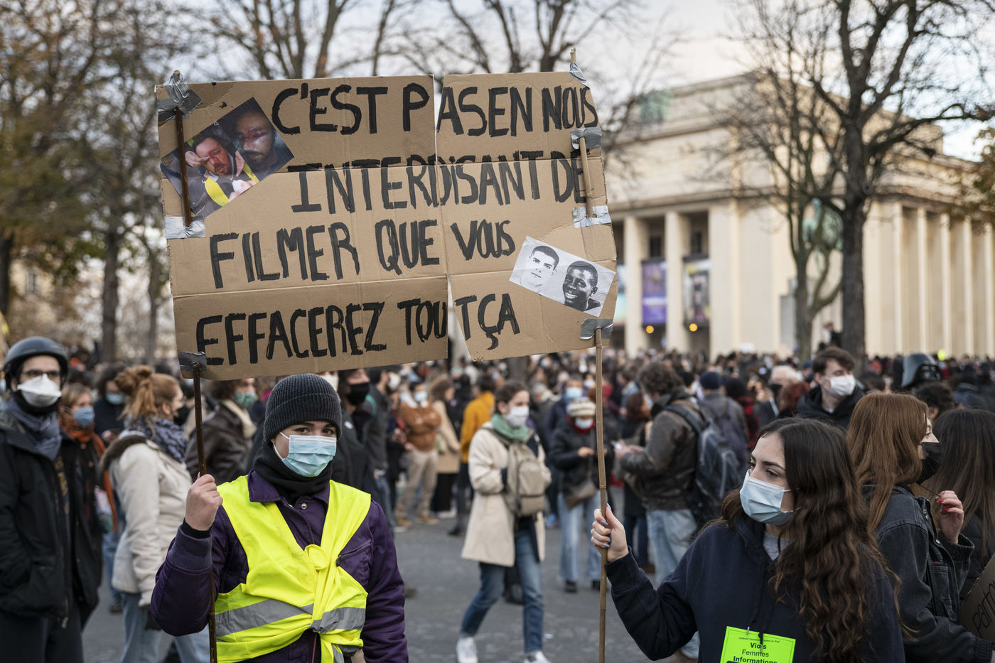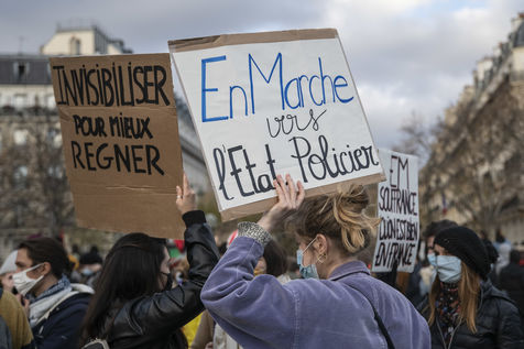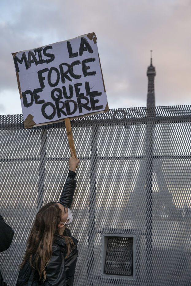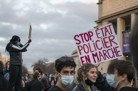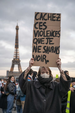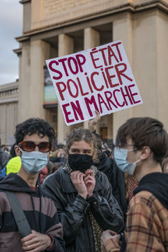 Le 21 novembre 2020, au moins 10 000 personnes se sont rassemblées place du Trocadéro à Paris, afin de dénoncer la proposition de loi sécurité globale, en cours de discussion à l?Assemblée, et l?adoption de l?article 24 la veille. Cet article très controversé prévoit de punir « d?un an d?emprisonnement et de 45 000 euros d?amende » le fait de diffuser des images non floutées d?un policier ou d?un militaire « dans le but manifeste qu?il soit porté atteinte à son intégrité physique ou psychique ».