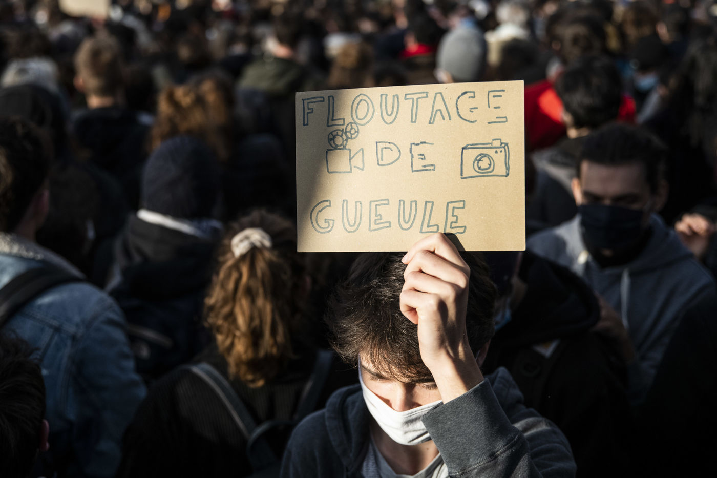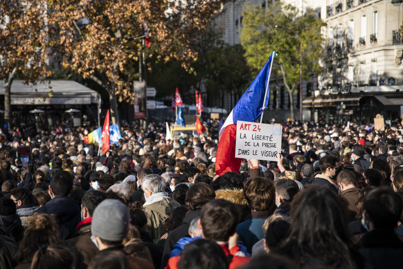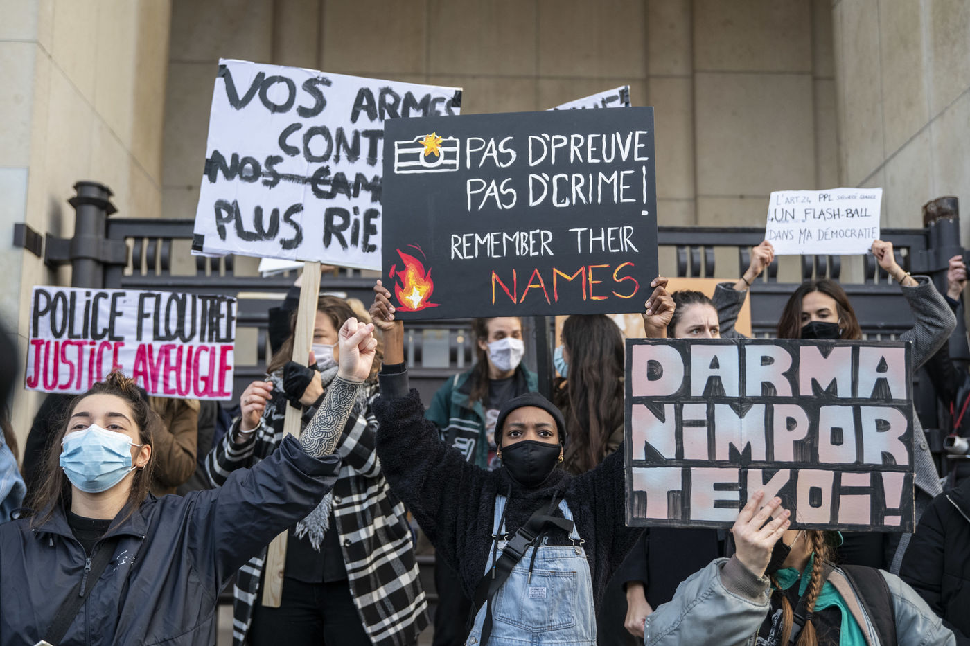 Le 21 novembre 2020, au moins 10 000 personnes se sont rassemblées place du Trocadéro à Paris, afin de dénoncer la proposition de loi sécurité globale, en cours de discussion à l?Assemblée, et l?adoption de l?article 24 la veille. Cet article très controversé prévoit de punir « d?un an d?emprisonnement et de 45 000 euros d?amende » le fait de diffuser des images non floutées d?un policier ou d?un militaire « dans le but manifeste qu?il soit porté atteinte à son intégrité physique ou psychique ».