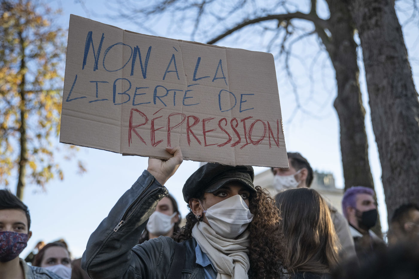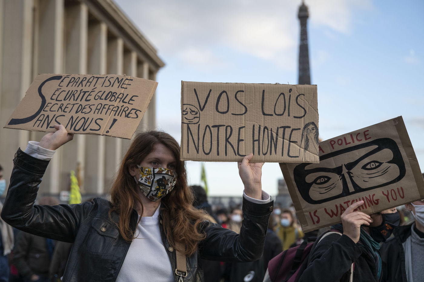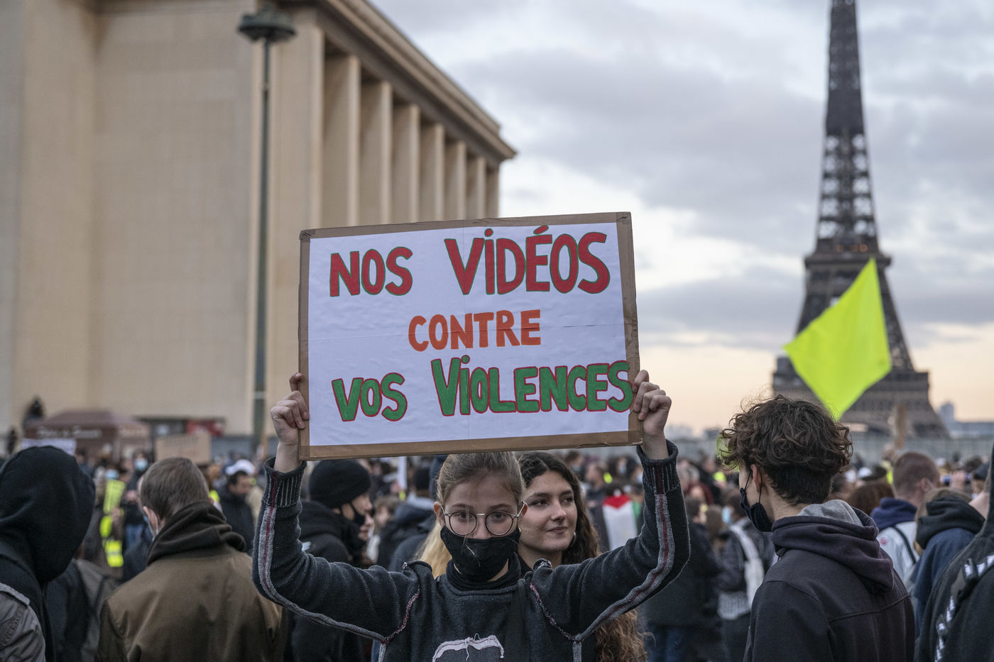 On 21 Novembre, at least 10000 people gathered on Tocadero Square in Paris to protest against the draft law on Global Security, which is being debated in the Parliament, and against the vote of article 24, the day before. This controversial article provides for punishing a year of imprisonment and a fine of 45,000 euros ?for broadcasting [?] with the aim of damaging his physical or mental integrity, the image of the face or any other element of identification ?of a police officer or a soldier in operation?.