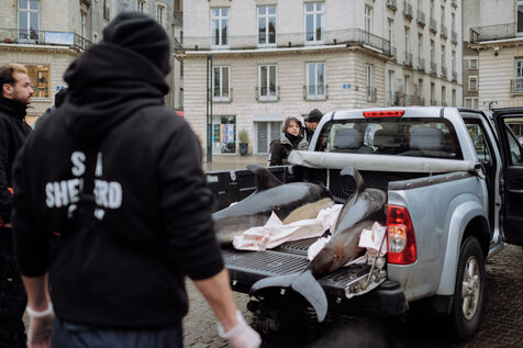 Activists from Sea Shepherd France display the bodies of two dolphins found the day before at sea, victims of captures by 10 and 12m long gillnetters off the coast of Sables d'Olonne. Caroline Roose, Member of the European Parliament, was on board with the Sea Shepherd crew during the recovery of the dolphins' bodies, and is present at the awareness-raising operation.