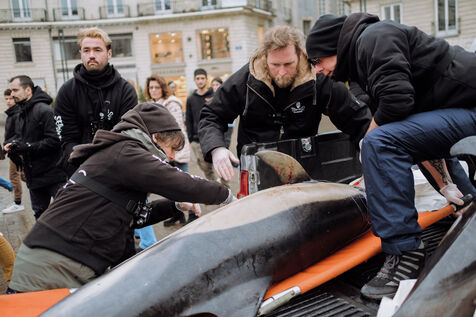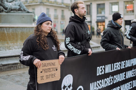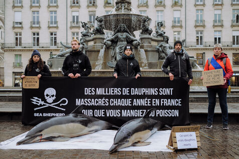 Sea Shepherd France's public awareness campaign on the accidental capture of dolphins by fishing gear in the Bay of Biscay, Place Royale in Nantes, 24 February 2023.