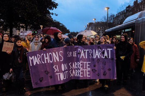 March on patriarchy, 8 March 2023 in Nantes, on the occasion of the International Women's Rights Day and the feminist strike, organised by CLAC, FemRev, Nosig, Nous Toutes 44, Paloma, Planning Familial 44, Pour une MEUF and Reboo-T.