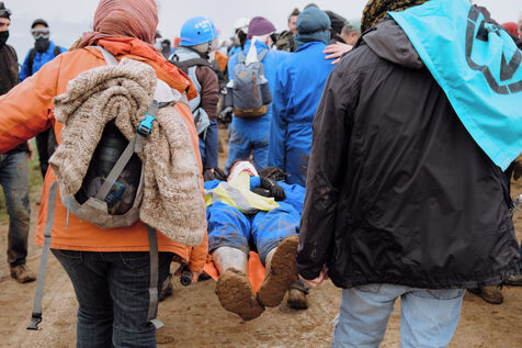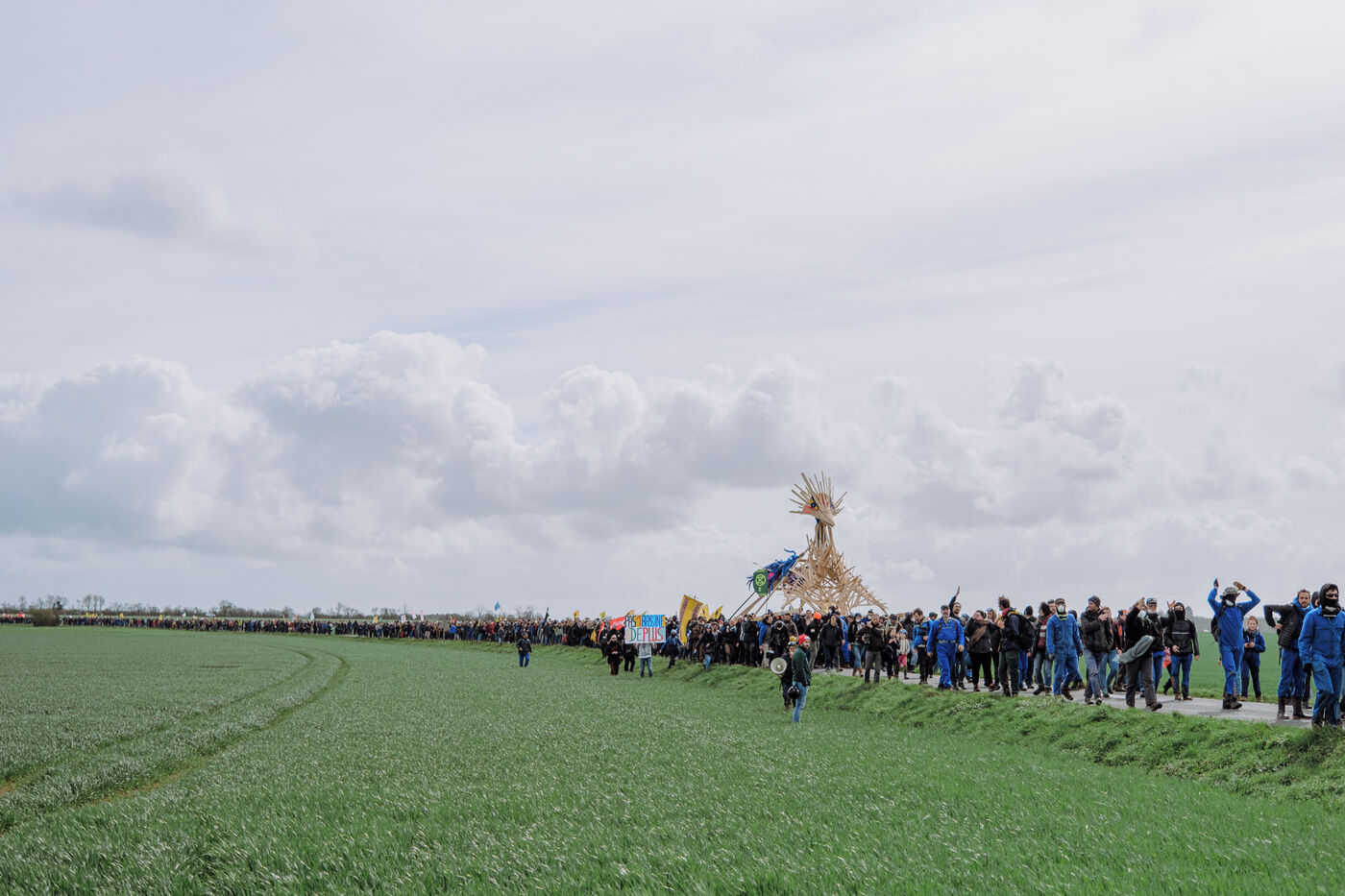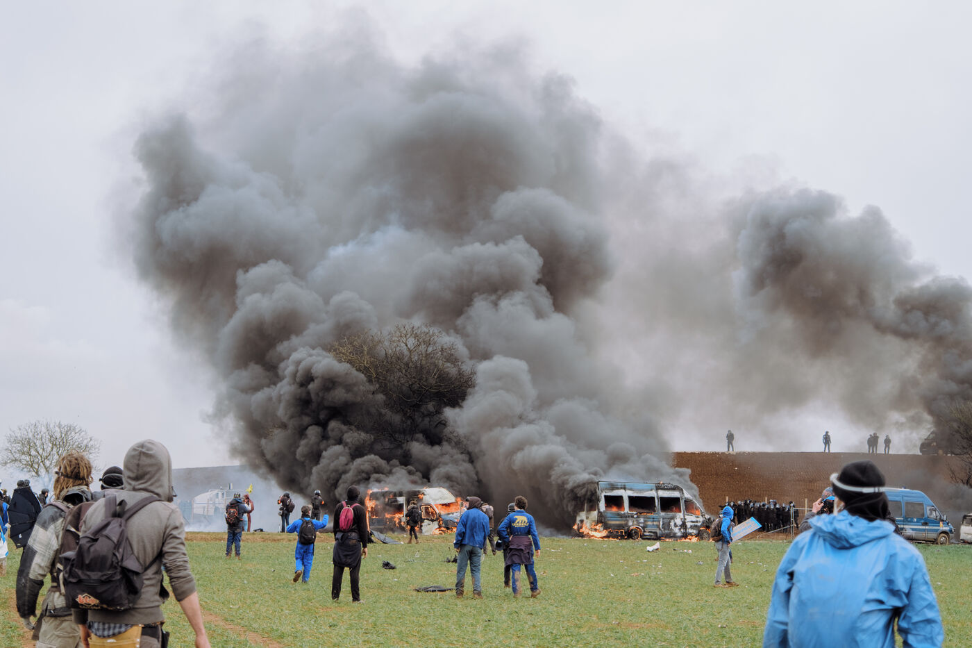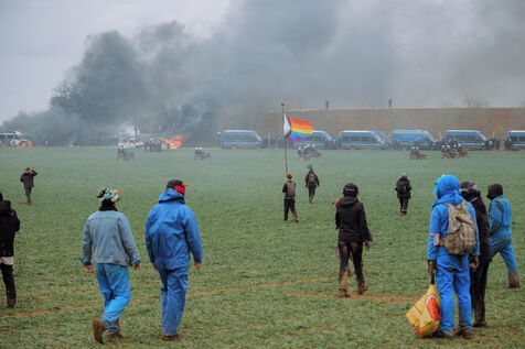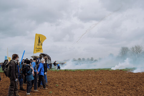 Mobilisation massive interdite contre les mégabassines à Sainte-Soline, le 25 mars 2023, en réponse à l'appel des Soulèvements de la Terre, de la Confédération paysanne et de Bassines non merci, pour protéger l'eau contre les méga-bassines, symbole d'une agriculture intensive qui assèche les sols et détruit la biodiversité. Plus de 20 000 personnes, d'après les organisateurs, ont marché du campement établi à Vanzay jusqu'à la bassine en construction de Sainte-Soline où était déployé un lourd dispositif des forces de l'ordre. De très violents affrontements ont eu lieu, qui ont fait de nombreux blessés, dont un manifestant dans le coma dont l'évacuation par le SAMU a été retardée par les forces de l'ordre.