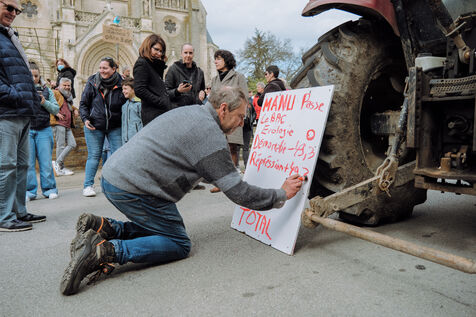 Dixième journée de grève et de manifestation contre la réforme des retraites et son adoption via le 49.3, dans la petite commune rurale de Sainte-Pazanne, le 28 mars 2023, en réponse à l'appel unitaire des huit confédérations syndicales françaises de salariés (CFDT, CGT, FO, Solidaires, FSU, CFTC, Unsa, CFE-CGC). Pour la première fois depuis le début du mouvement, plus de 200 personnes se sont rassemblées dans cette commune, pour pouvoir manifester localement et sans violences.