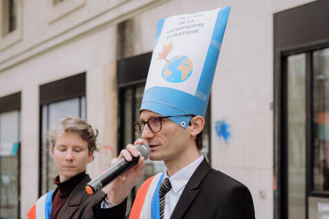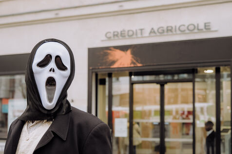 In front of an audience of industrialists and financiers wearing Scream masks, a Minister for Climate Disaster officiated by denouncing the contradiction between Crédit Agricole's display of a responsible financing policy and its links with Total. The wedding ended with the unexpected birth of a baby EACOP, a pipeline project in Uganda and Tanzania that will exacerbate climate change and threaten the land of tens of thousands of people, as well as nature reserves.