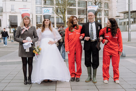 On April Fool's Day, in front of a Crédit Agricole branch, the Stop Total 44 collective, which brings together activists from Attac, Alternatiba, Extinction Rébellion, GIGNV (Groupe d'Intervention des Grenouilles Non Violentes), Greenpeace, NDDL Poursuivre Ensemble, Solidaires and Survie, is staging a parody wedding between Total and Crédit Agricole to denounce their financial links via Crédit Agricole's subsidiary Amundi and the financing of oil projects, notably EACOP.
