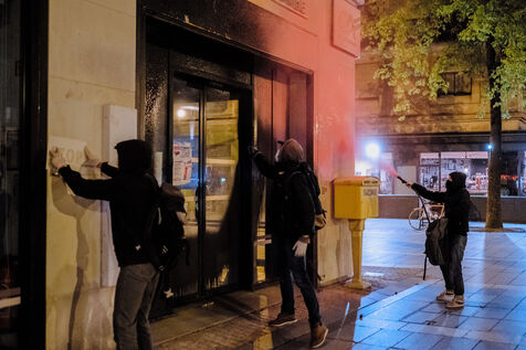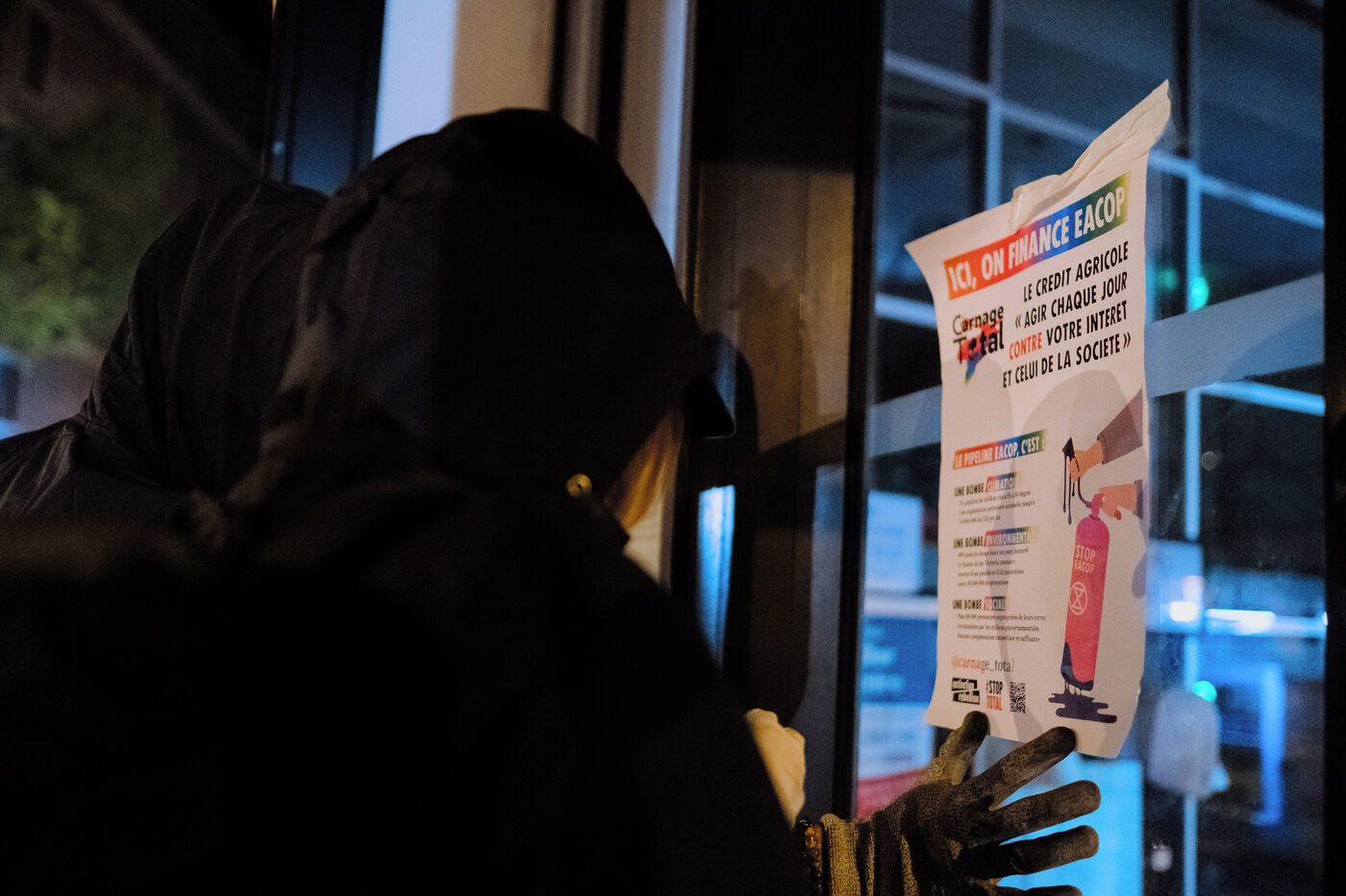 Extinction Rebellion sprays paint on a Crédit Agricole bank office against Eacop