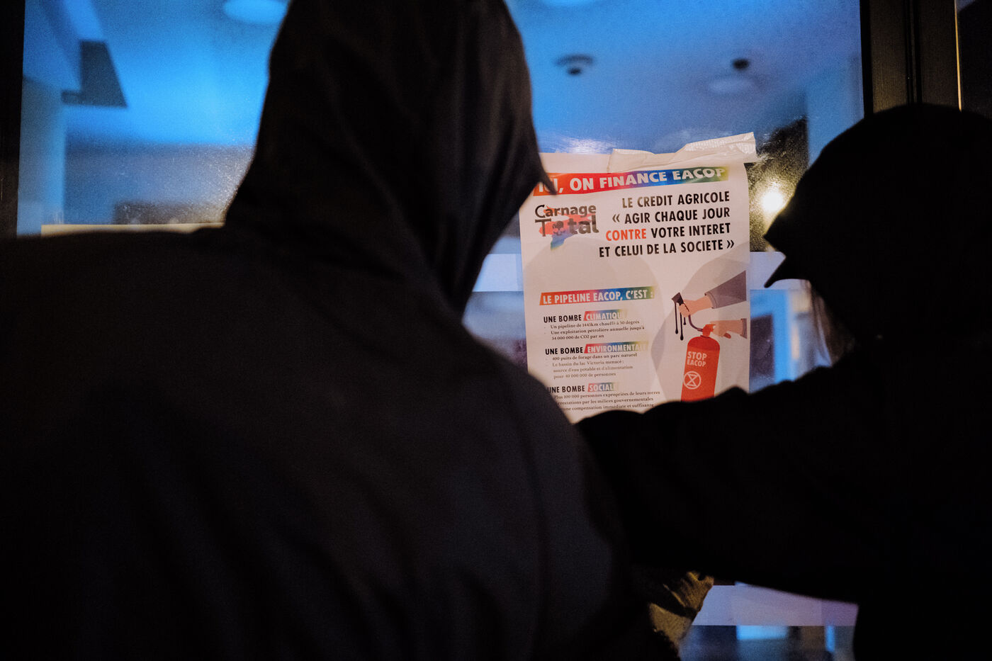 Activists from the Extinction Rebellion Nantes movement covered the facades of a Crédit Agricole branch with paint and Stop Eacop tags, to protest against the bank's financing of Total's activities through its subsidiary Amundi.