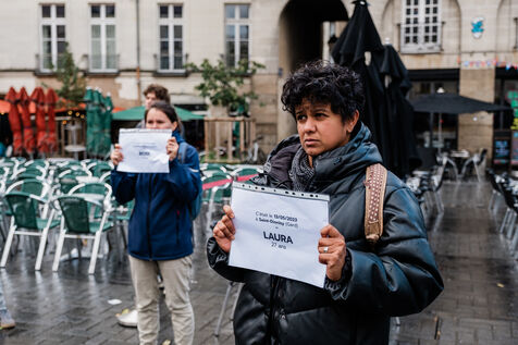 Die-in by Nous Toutes in tribute to the victims of feminicide in Nantes, 4 November 2023. The activists listed the first names of the victims, their ages, the date and location of the feminicide, and then observed a minute's silence.
