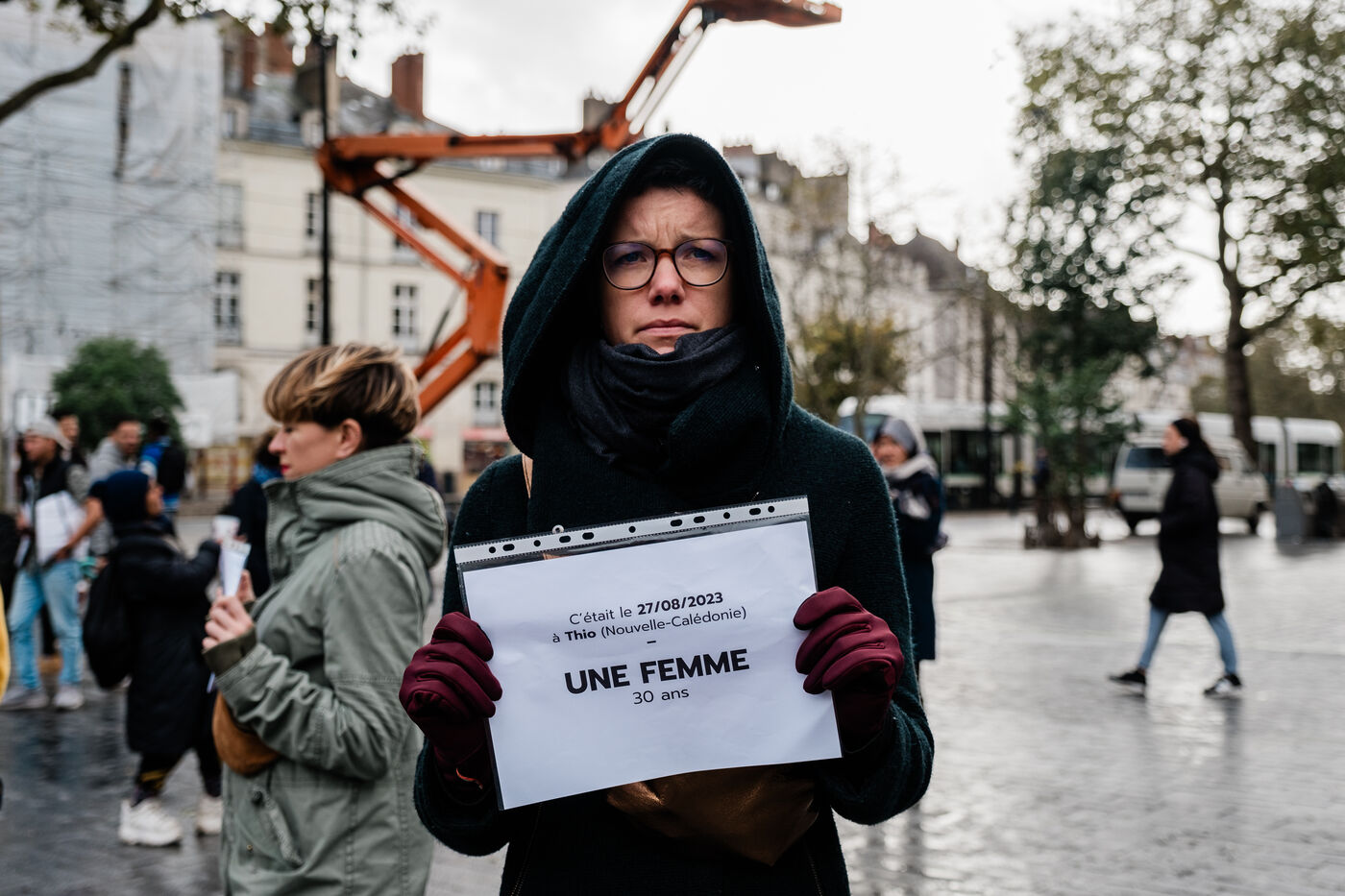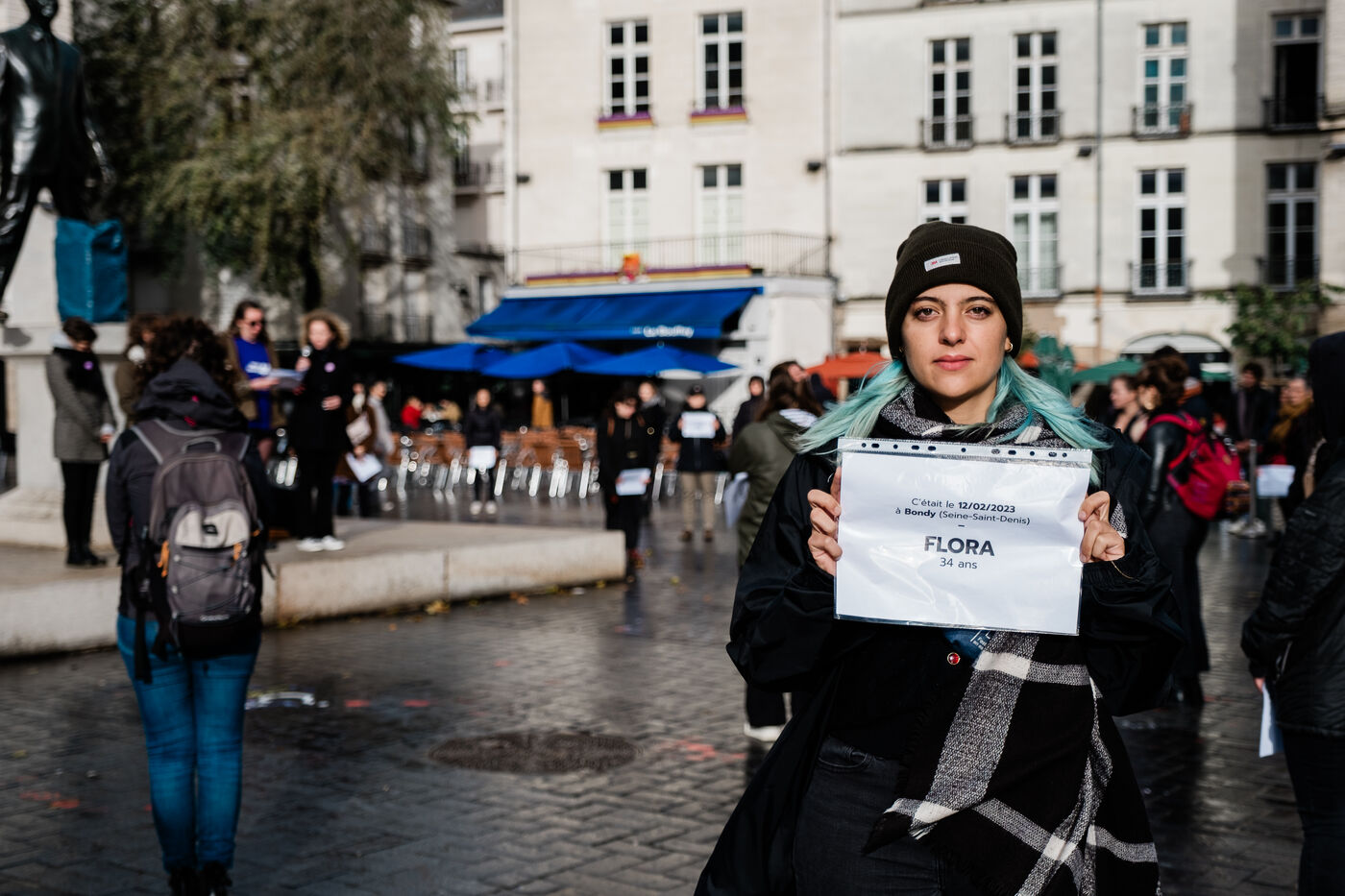 Die-in de Nous Toutes en hommage aux victimes de féminicides à Nantes, le 4 novembre 2023. Les militantes ont énoncé un à un les prénoms des victimes, leur âge, la date et le lieu du féminicide puis observé une minute de silence.