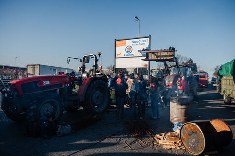 Plusieurs dizaines d'agriculteurs de la Confédération paysanne 44, du CIVAM 44 et du GAB 44, avec environ 35 tracteurs, bloquent près de Nantes la centrale d'achat SCA Ouest de l'enseigne de grande distribution Leclerc depuis lundi 29 janvier au soir.