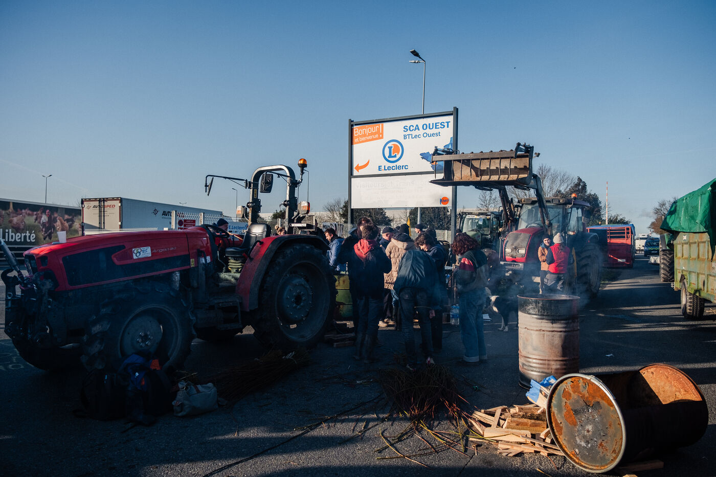 Several dozen farmers from Confédération Paysanne 44, CIVAM 44 and GAB 44, with around 35 tractors, have been blocking the SCA Ouest purchasing center of the Leclerc supermarket chain near Nantes since the evening of Monday January 29.