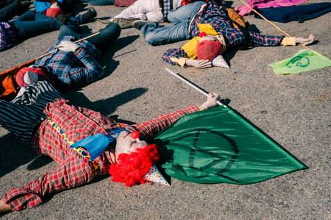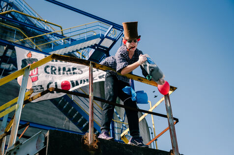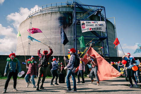 Extinction Rebellion celebrates 100 years of Total at the Donges oil refinery on March 23, 2024. More than 50 activists from Nantes and all over France easily took to the Seveso-classified site of France's second-largest refinery. Disguised as clowns, the activists came to denounce 100 years of Total by setting up a circus tent at the foot of a tank which they sprayed with (water-based) paint, singing and dancing, before a die-in under the effect of (fake) oil spilled on them by a clown disguised as Patrick Pouyanné, CEO of the company. The party resumed in a joyous, non-violent mood, watched by refinery employees, before the activists left, greeted outside by the gendarmerie, who took one person into custody, who was released the same evening.