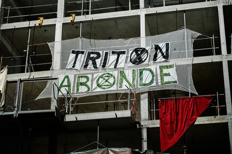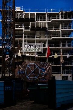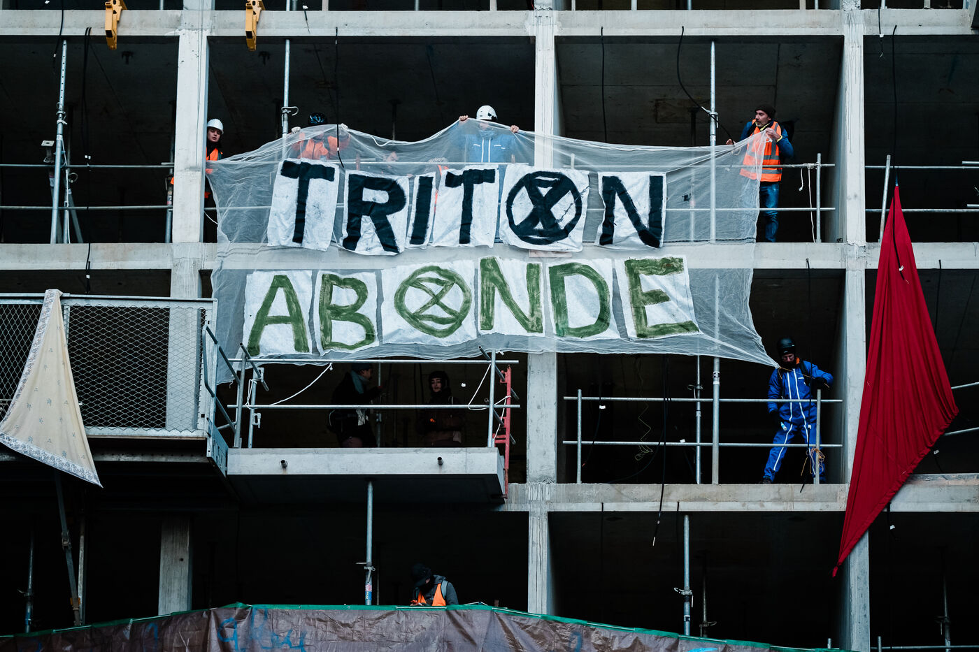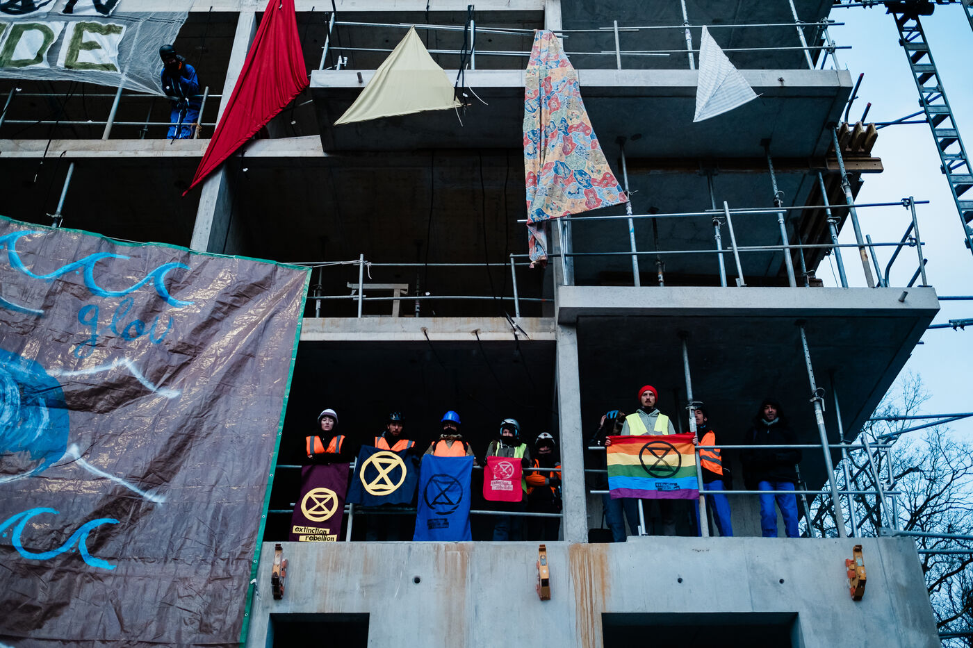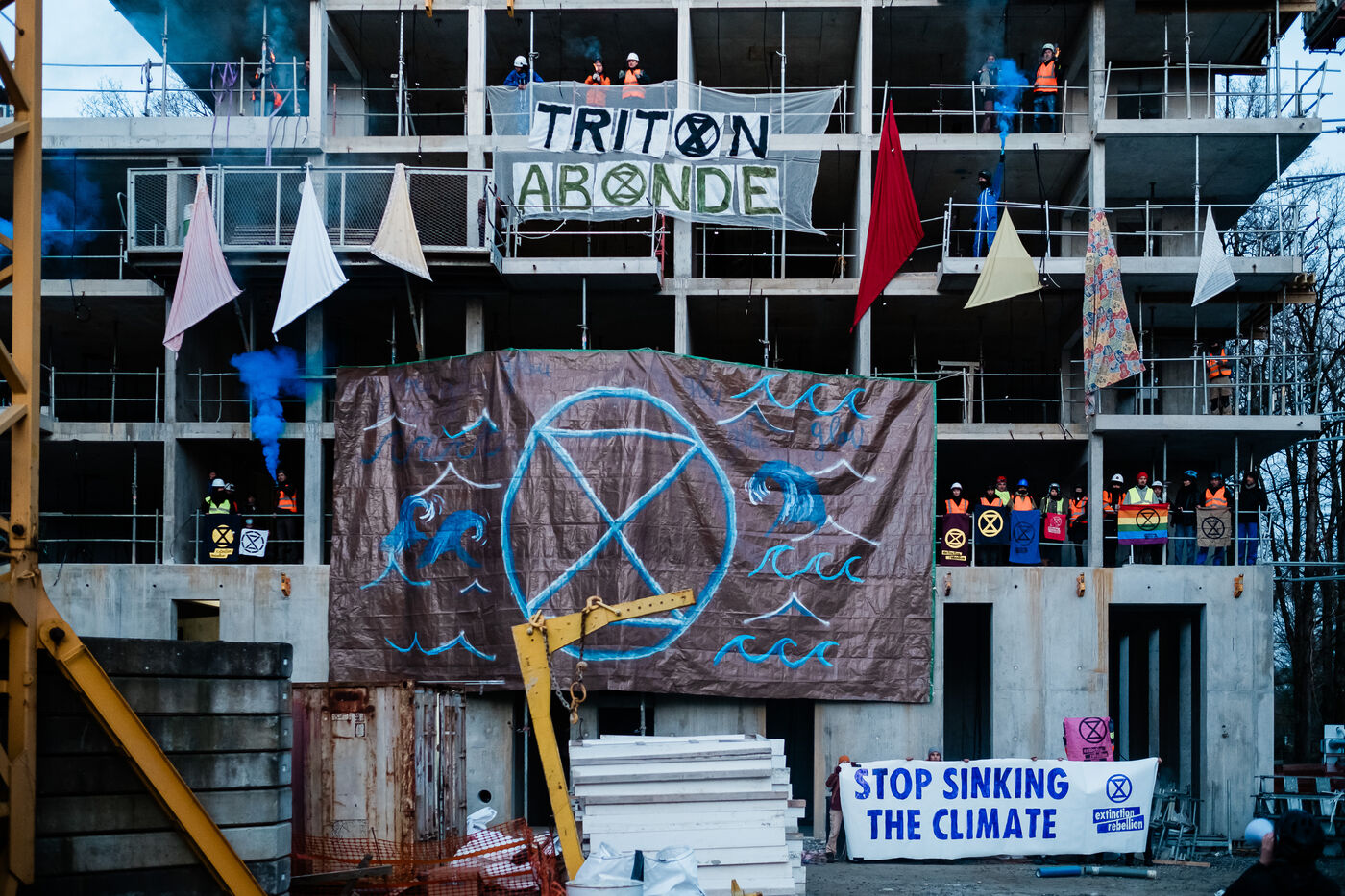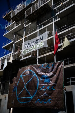 Action du mouvement écologiste de désobéissance civile non violente Extinction Rebellion sur un chantier de logements de la métropole de Nantes, le 13 décembre 2024, pour dénoncer la bétonisation et lutter contre l'artificialisation des sols et ses impacts sur le climat, les inondations et la destruction des espaces naturels et de la biodiversité.