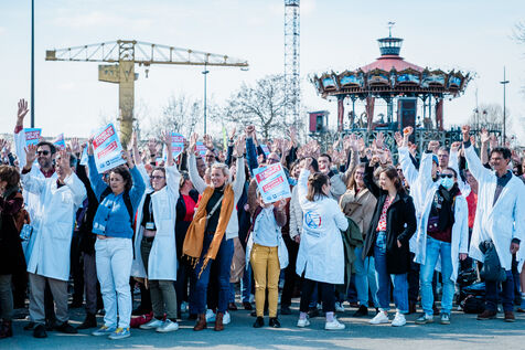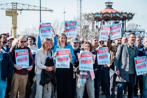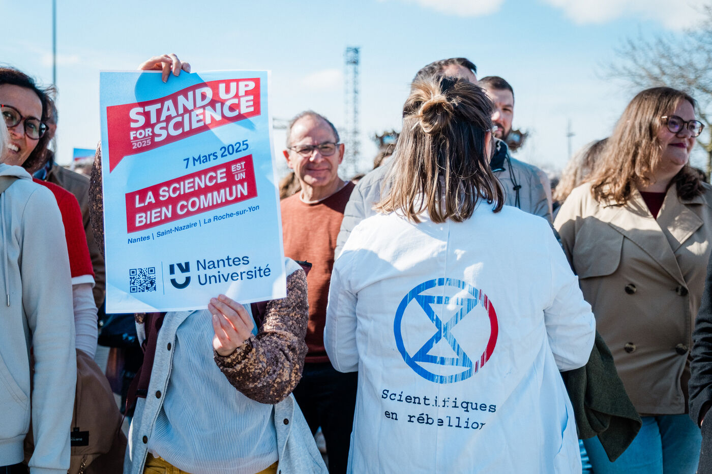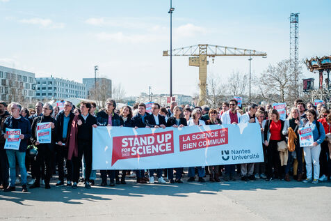 Rassemblement de 350 personnes pour le mouvement Stand up for Science, organisé par l'Université de Nantes, le 7 mars 2025, en soutien aux manifestations du même nom organisées le même jour à travers les Etats-Unis, pour défendre la recherche et les institutions scientifiques menacées de coupes budgétaires, censures et licenciements par l'administration Trump et le DOGE (département de l'efficacité gouvernementale) de Musk.