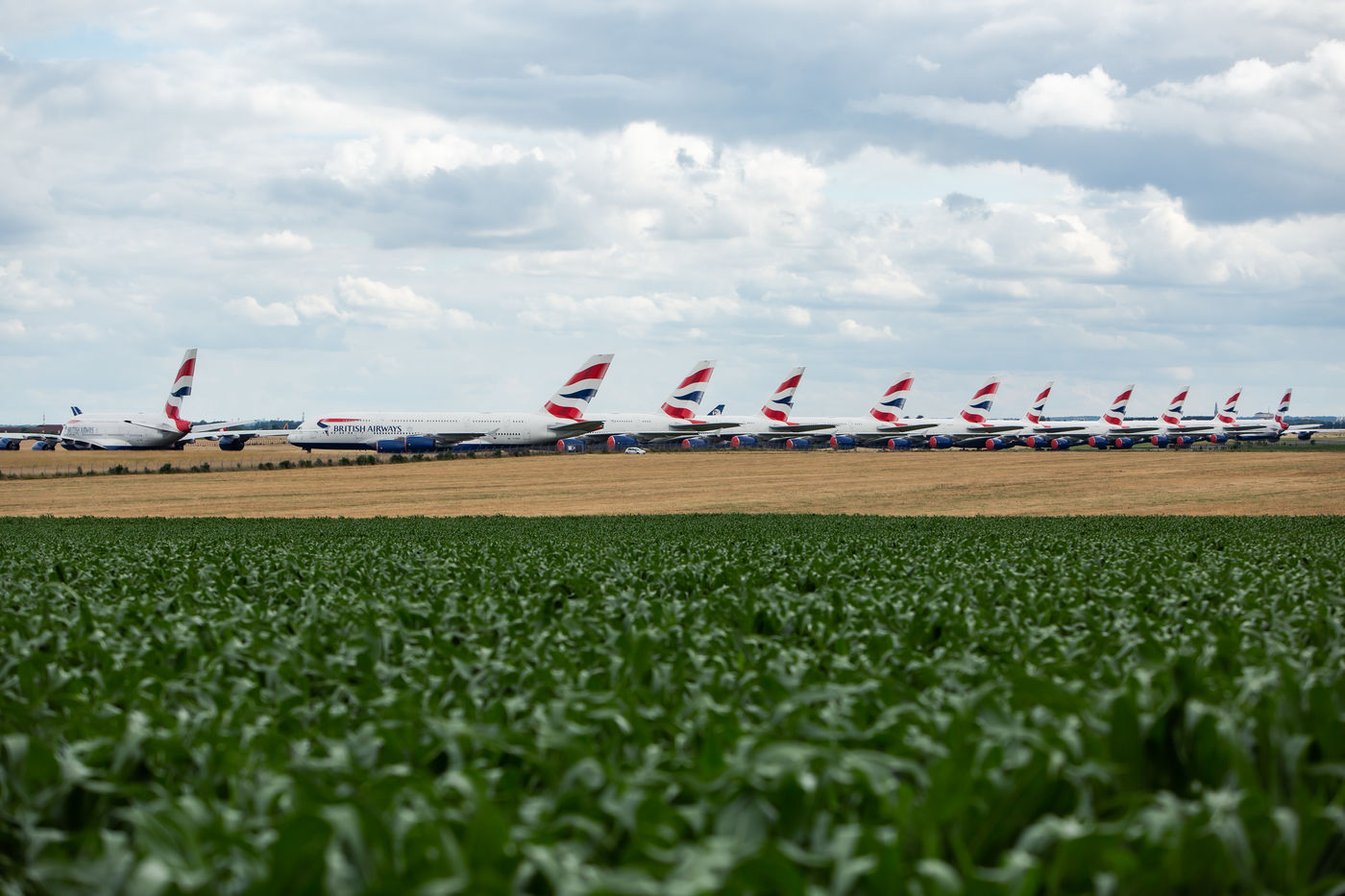 En raison de la baisse d activite lie a la COVID-19, la compagnie aerienne anglaise British Airways stock au sol, et pour une duree de six mois environ, 11 de ses avions A380 sur l aeroport Marcel Dassault de Chateauroux-Deols. Chateauroux, le 27 juin 2020