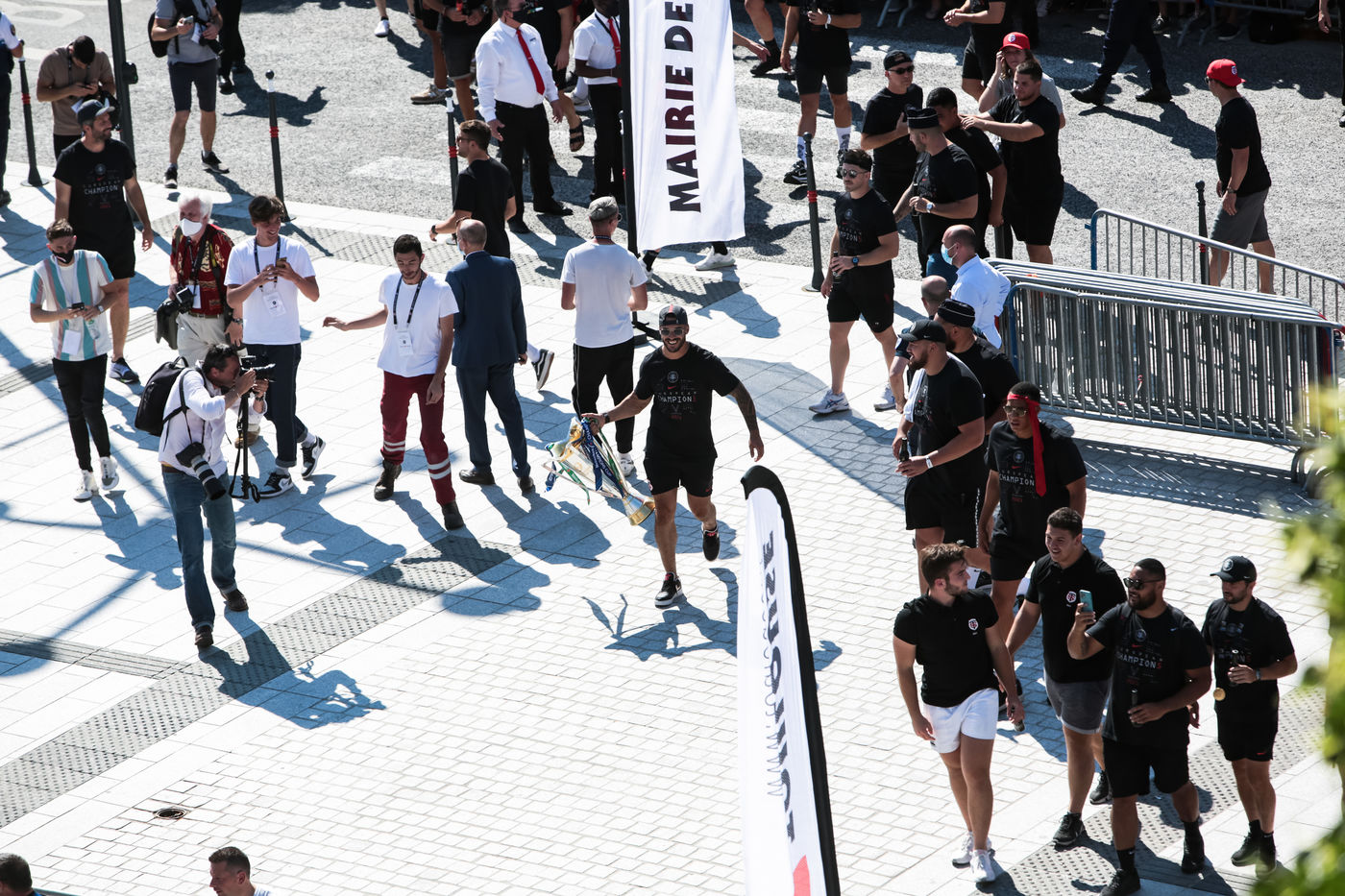 Les joueurs de rugby du stade Toulousain, vainqueurs cette annee de la coupe d Europe et du top 14, paradent dans les rues de Toulouse. Des supporters patientent le long des ramblas. Toulouse, France le 26 juin 2021.