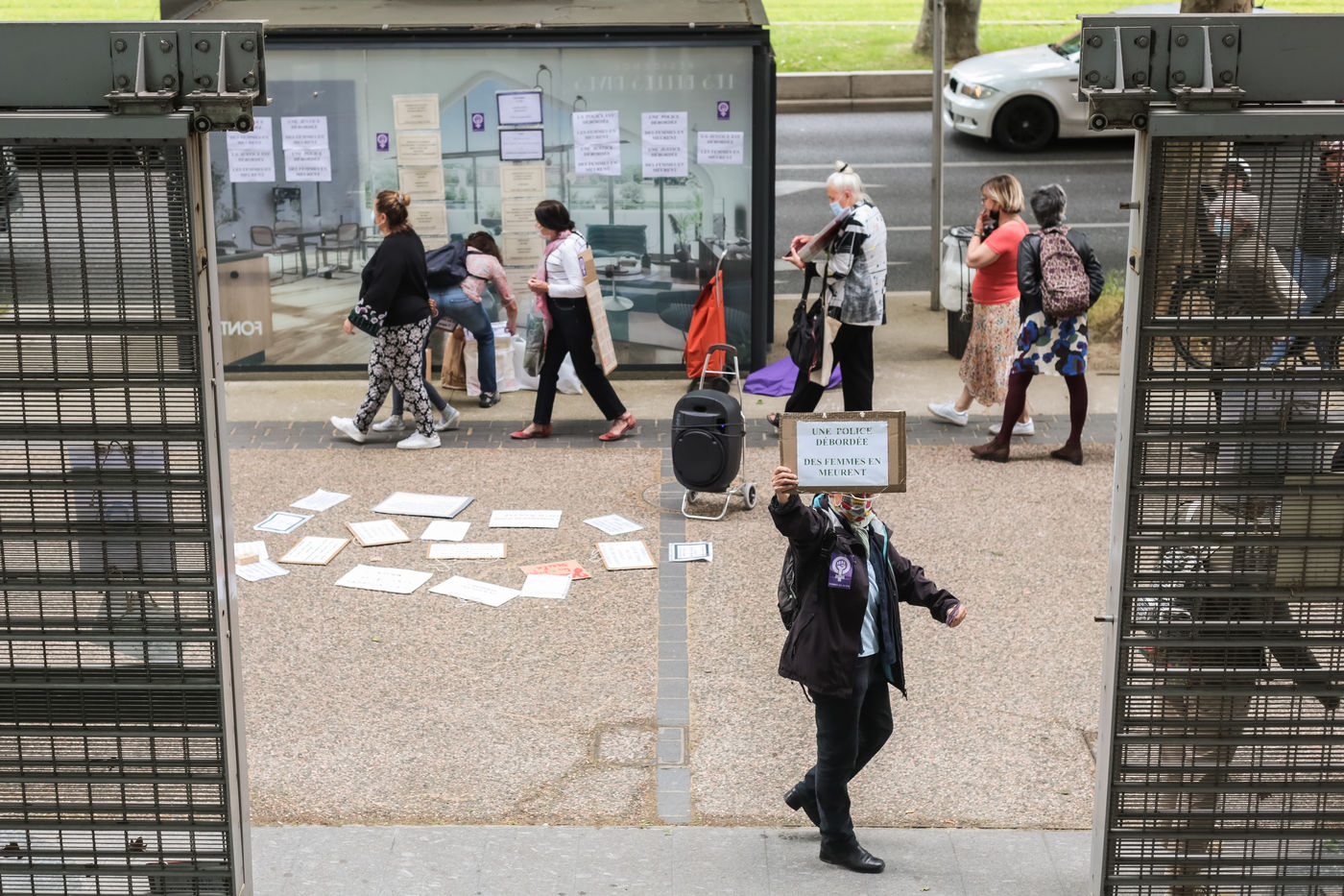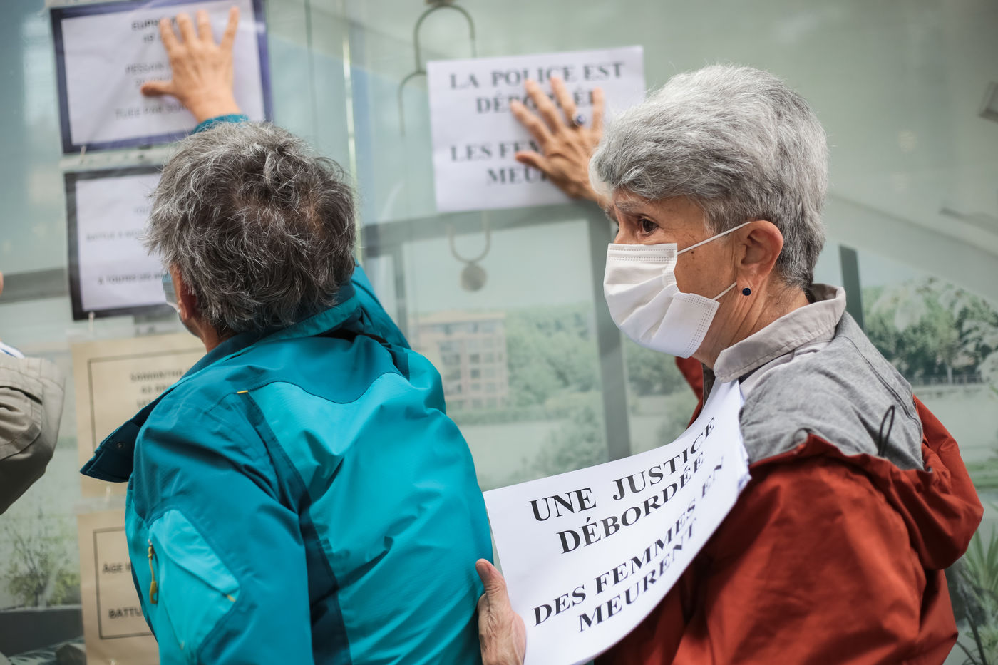 The Midi-Pyrenees Collective for Women's Rights are demonstrating in front of the courthouse in Toulouse. These women are angry at the increasing number of feminicides, that the existing laws are poorly applied and that the perpetrators of domestic violence are very rarely convicted with derisory sentences. Toulouse, 2 June 2021.