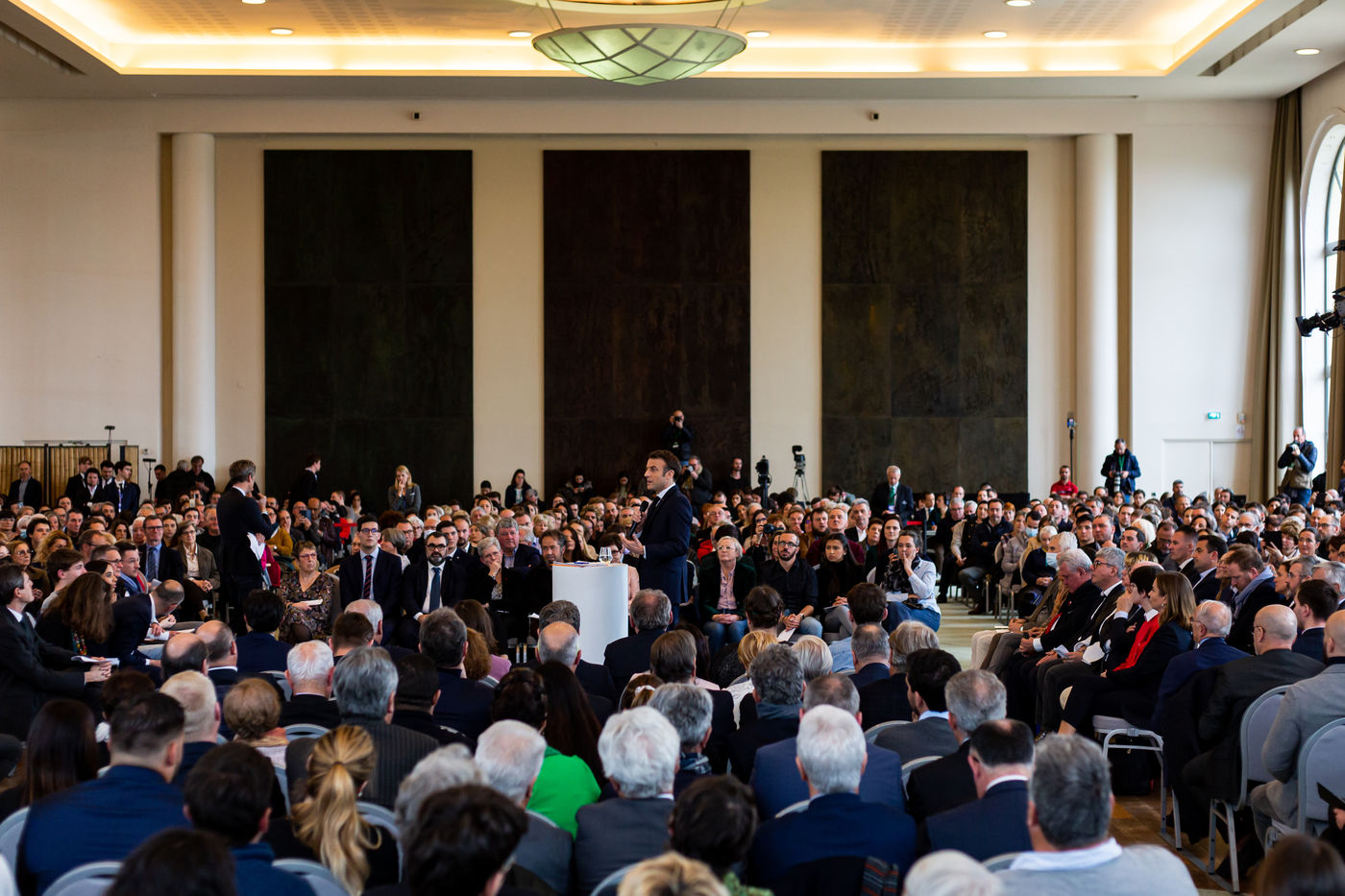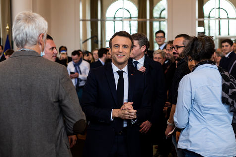 Emmanuel Macron, candidat a sa re-election a la presidence de la Republique echange avec des citoyens dans la ville de Pau, le 18 mars 2022.