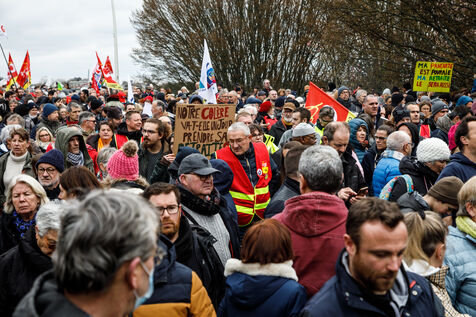 7 March 2023, the sixth day of inter-union mobilisation against Elisabeth Borne's government pension reform. The unions' slogan: stop France. In Lorient, in Brittany, two demonstration processions, one from Lorient and the other one from Lanester, merged in front of the City Hall.