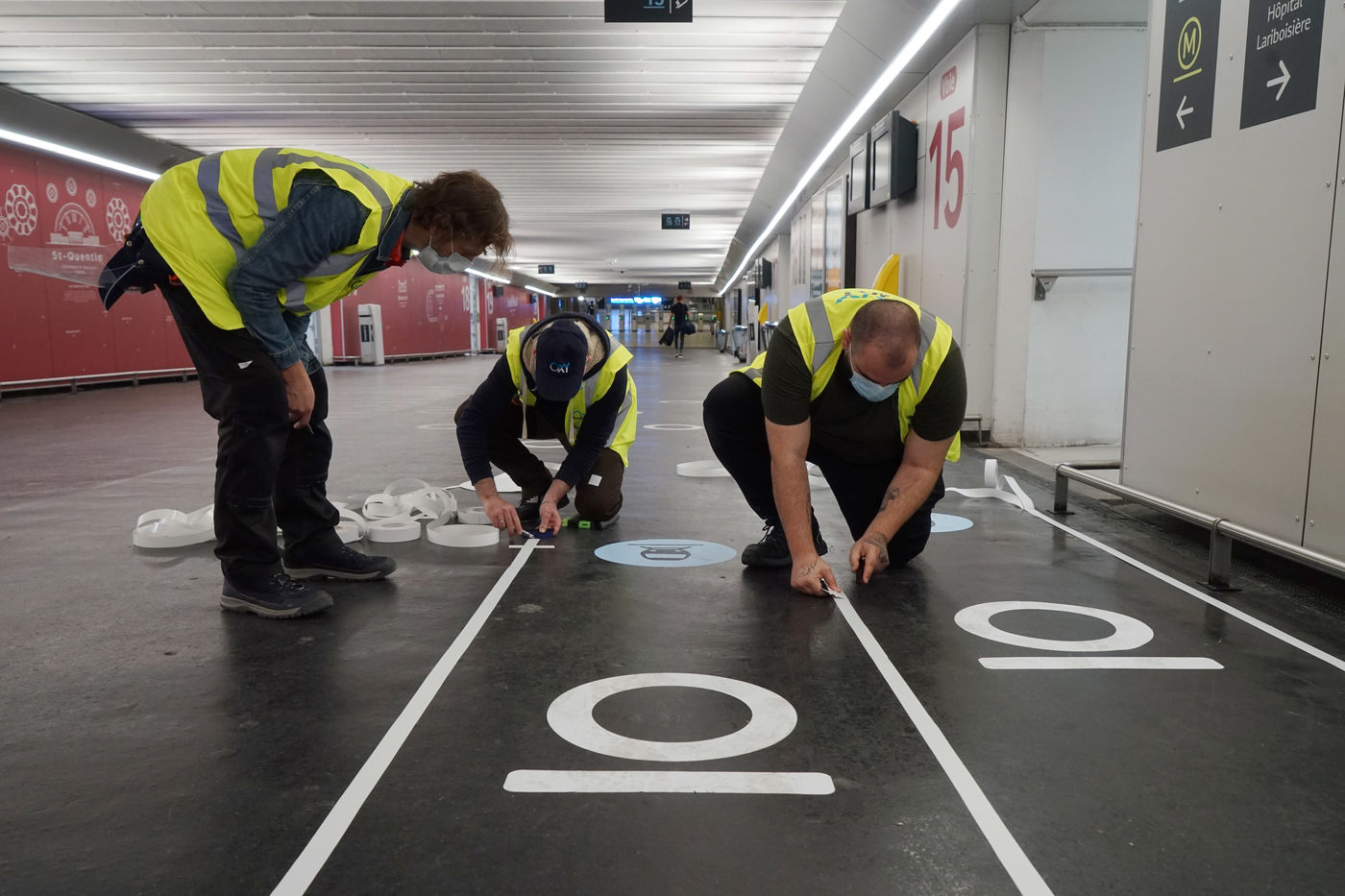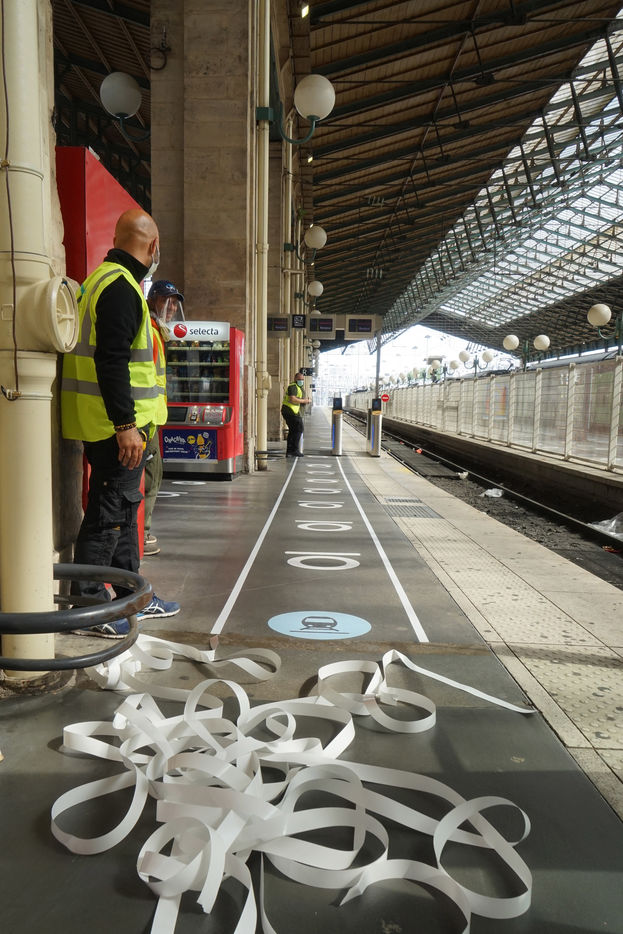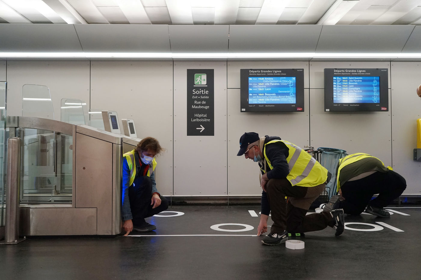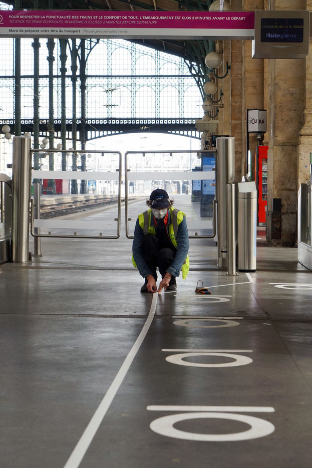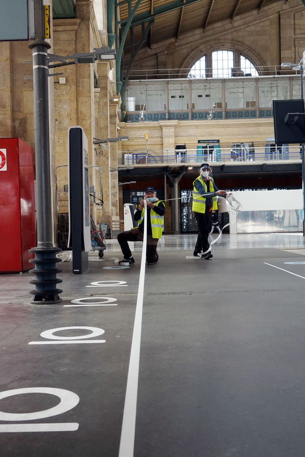 A few days before the deconfinement of 11 May, the company in charge of setting up a system to enforce social distancing in the station is putting down its last adhesives. They will have been working non stop for five days, getting the instructions only at the last minute.