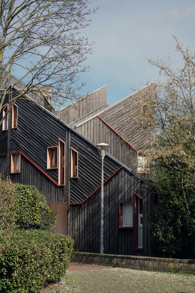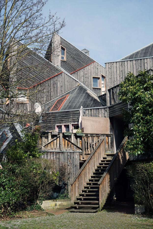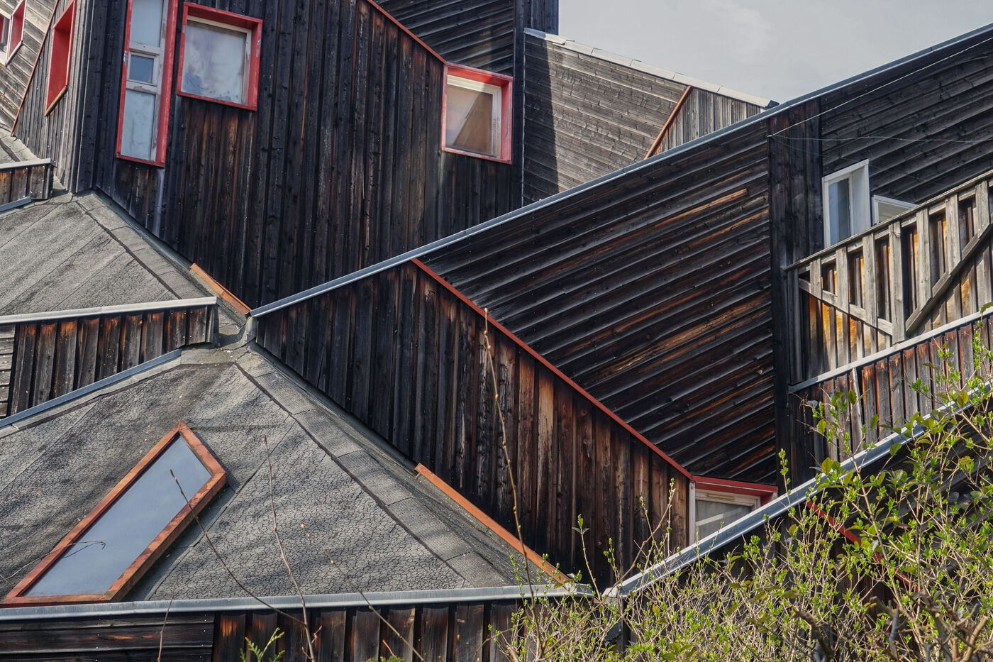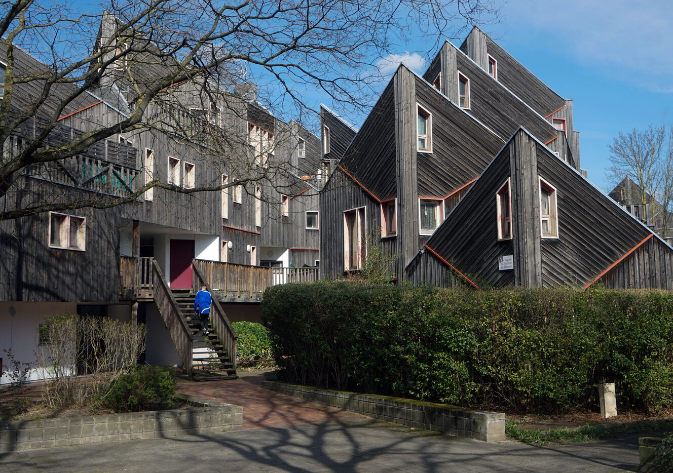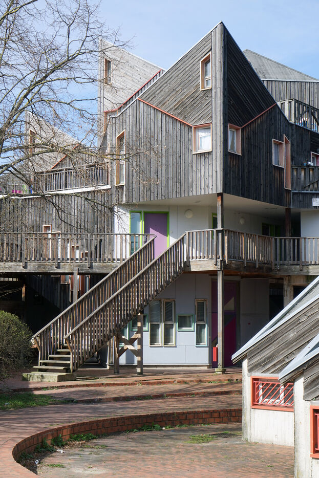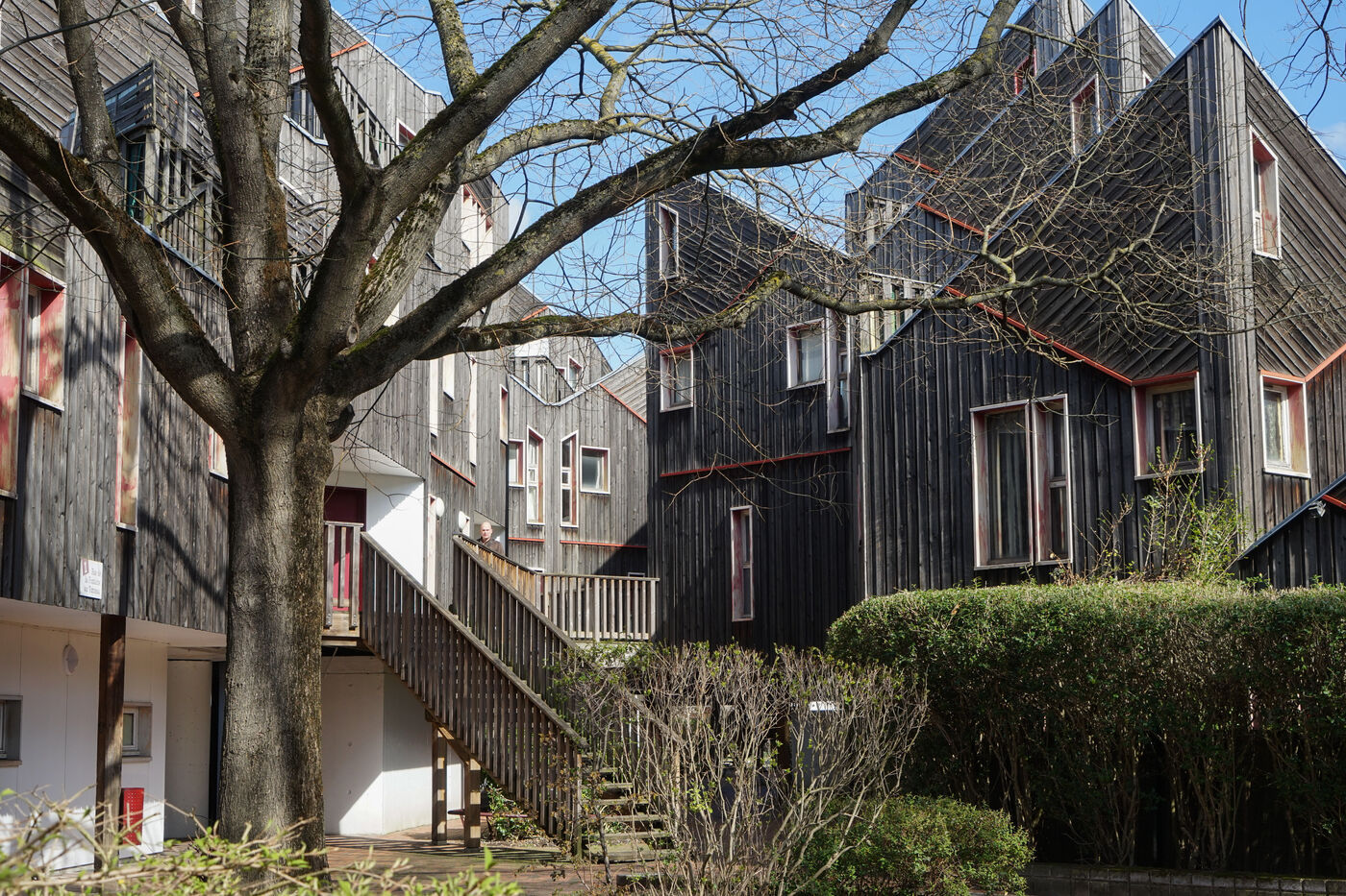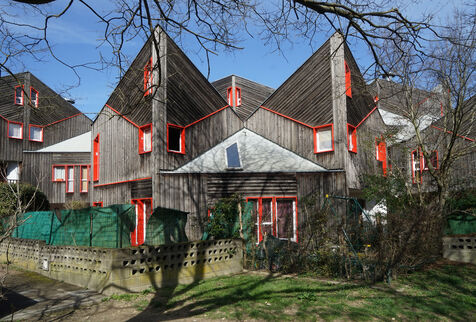 The result was this astonishing neo-medieval low-cost housing estate of pointed wooden houses stacked and interlocking with a large green space all around.
