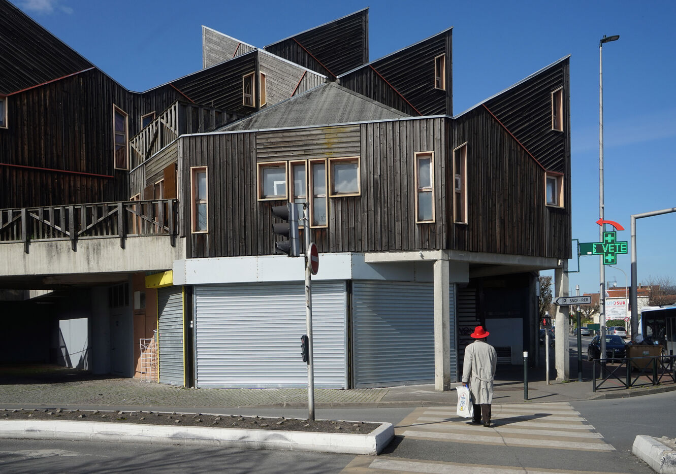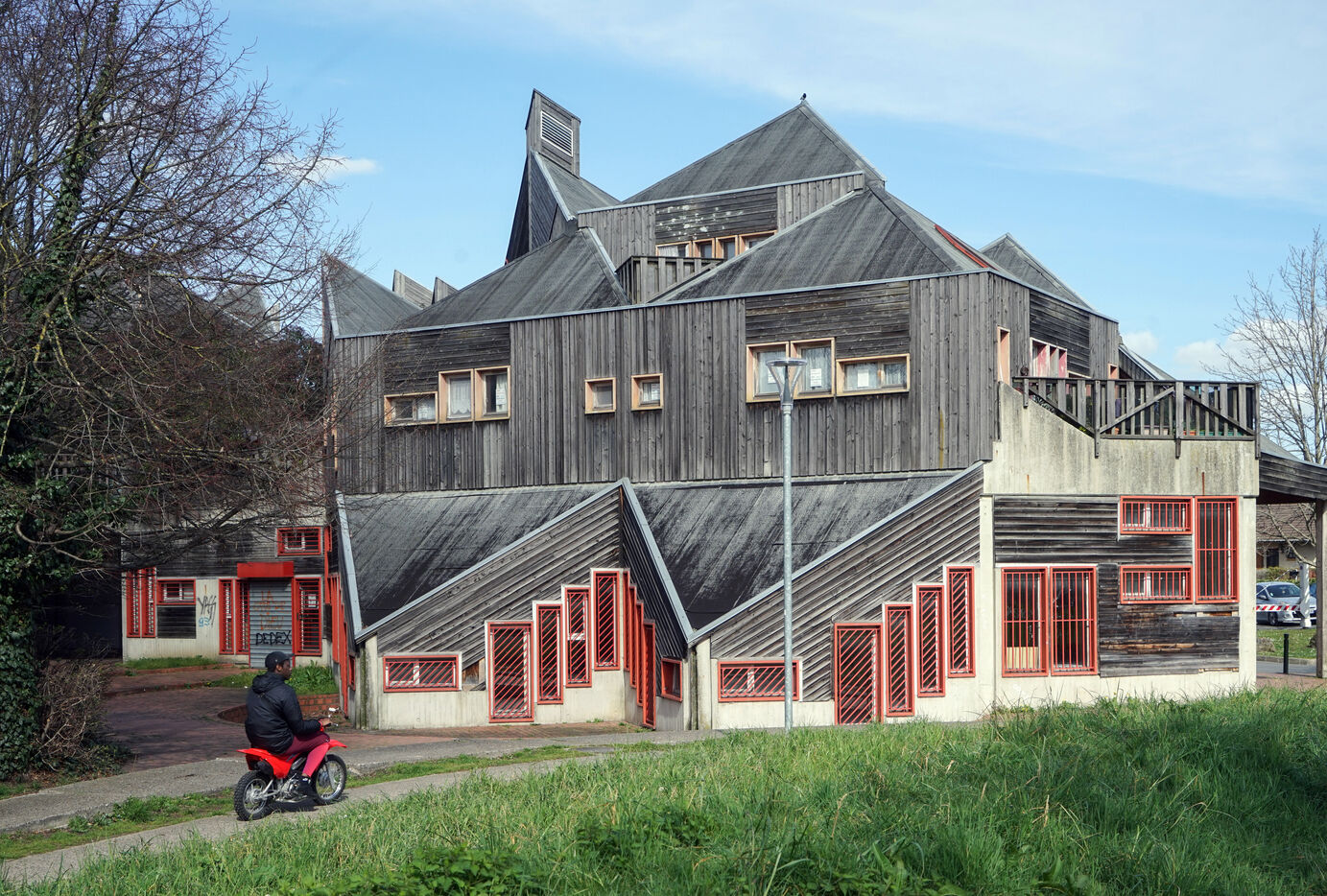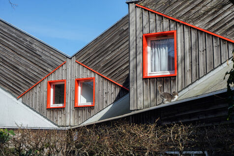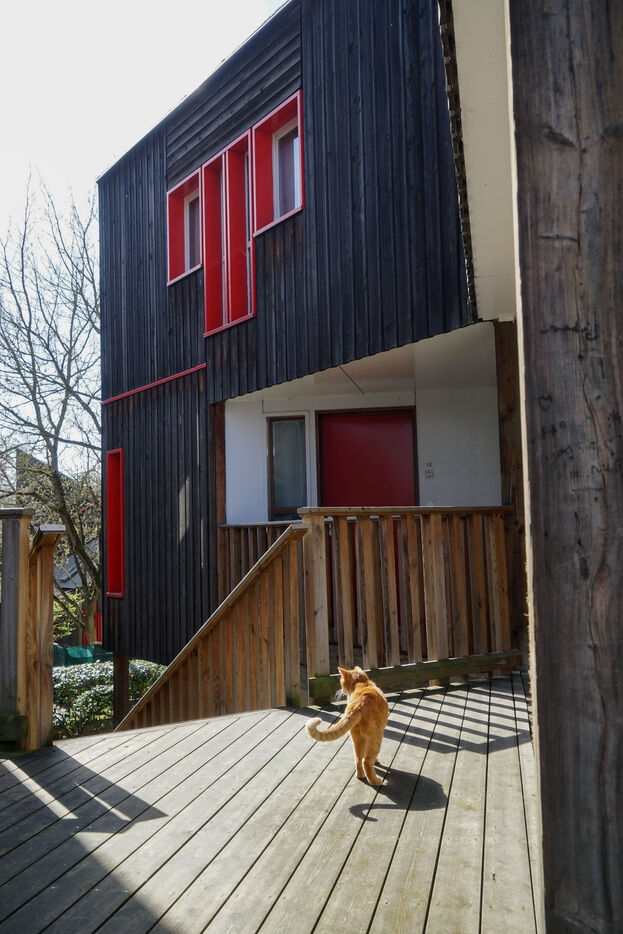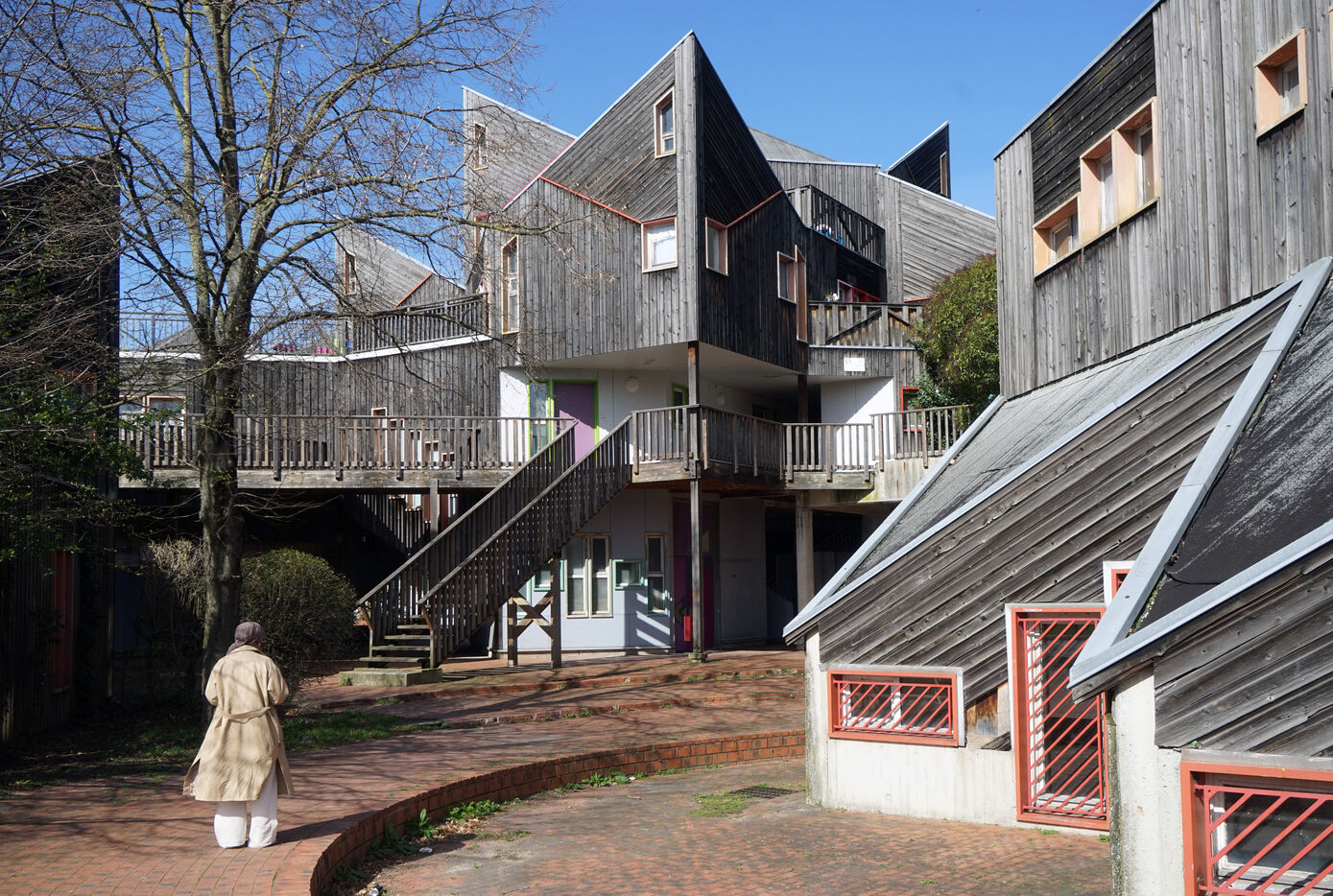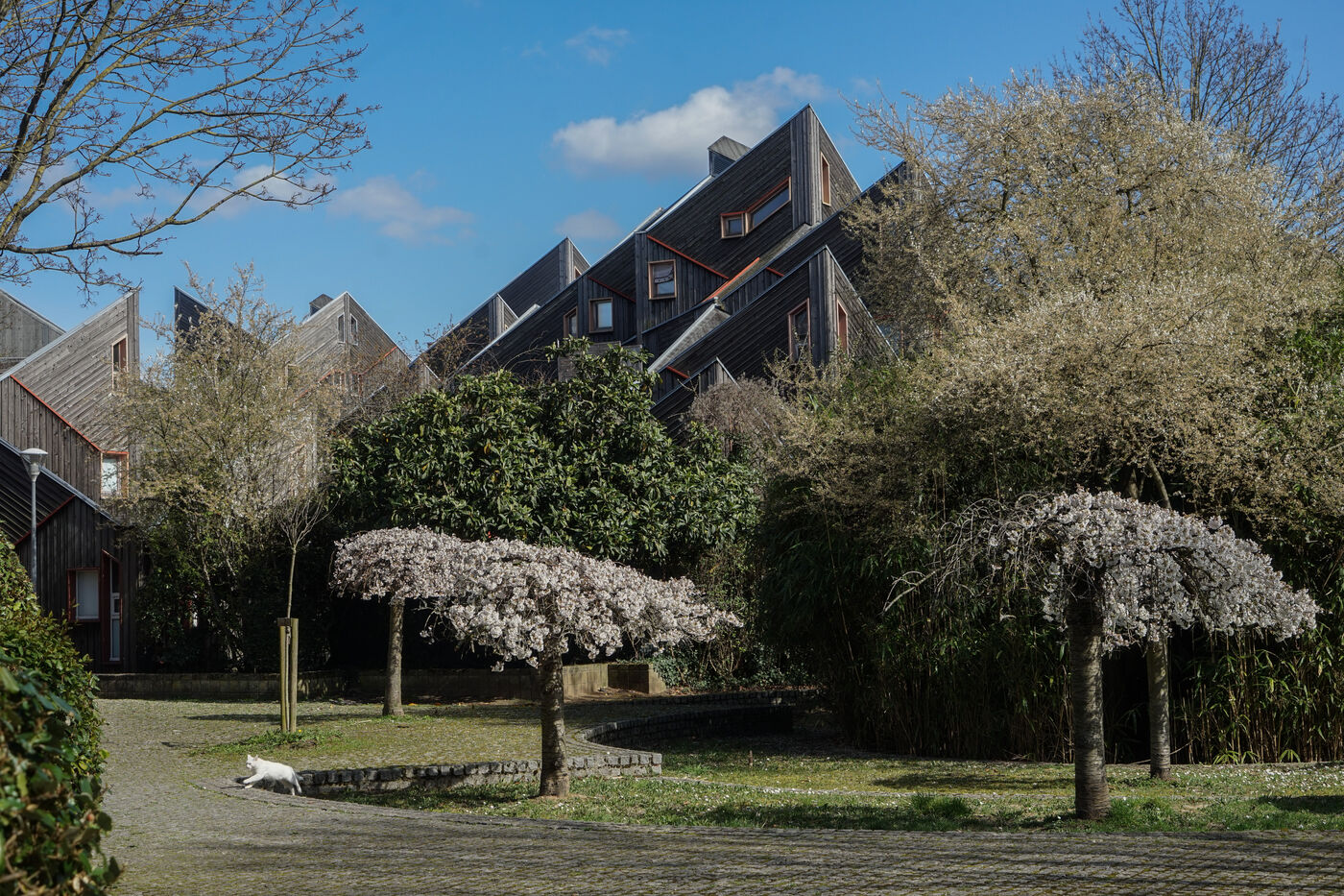 The result was this astonishing neo-medieval low-cost housing estate of pointed wooden houses stacked and interlocking with a large green space all around.