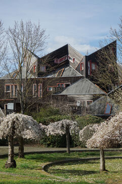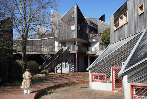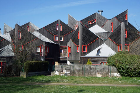 Nait alors cette étonnante coté HLM néo-médiévale de maisons pointues tout en bois empilées et imbriquées avec un grand espace vert tout autour.