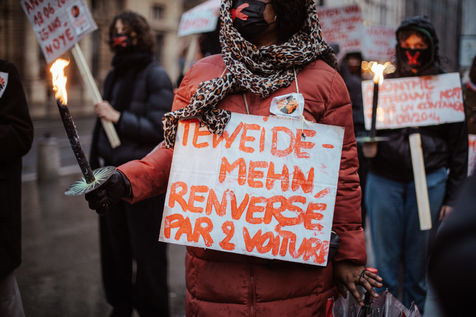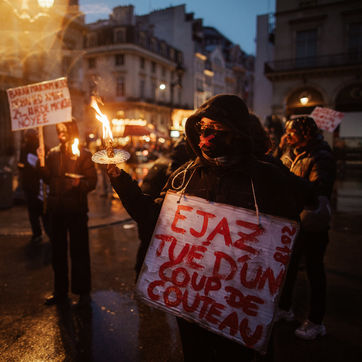 "Mohammed 2015, percuté par une voiture", "Ejaz tué d'un coup de couteau", "Yohanes, bébé mort"... Autant de prénoms et de causes de décès écrits en lettres rouges et brandis sur des pancartes par des dizaines de manifestants lors d'un rassemblement en hommage aux morts et aux disparus aux frontières, place du Palais Royal à Paris, dimanche 6 février 2022. A la tombée de la nuit les petits flambeaux illuminent les visages des manifestants venus à l'appel du collectif Actions Refugees Paris, organisatrice de l'évènement avec d'autres associations de solidarité avec les personnes exilées. Au cours du rassemblement, des prises de parole rendent hommages aux disparus. Cette commémoration dénonce aussi les politiques migratoires meurtrières qui coûtent la vie à des milliers de personnes chaque année. L'Organisation Internationale pour les migrations fait état de plus de 45 000 morts et disparus aux frontières depuis 2014. Elle met également en garde contre les drames massifs qui se banalisent. Une réalité visible à la frontière franco-britannique où on compte près de 350 morts depuis ces deux dernières décennies.