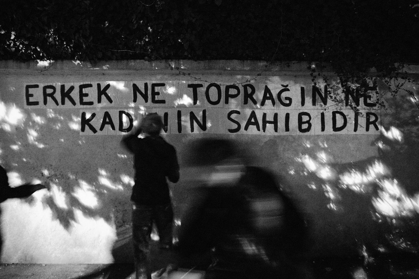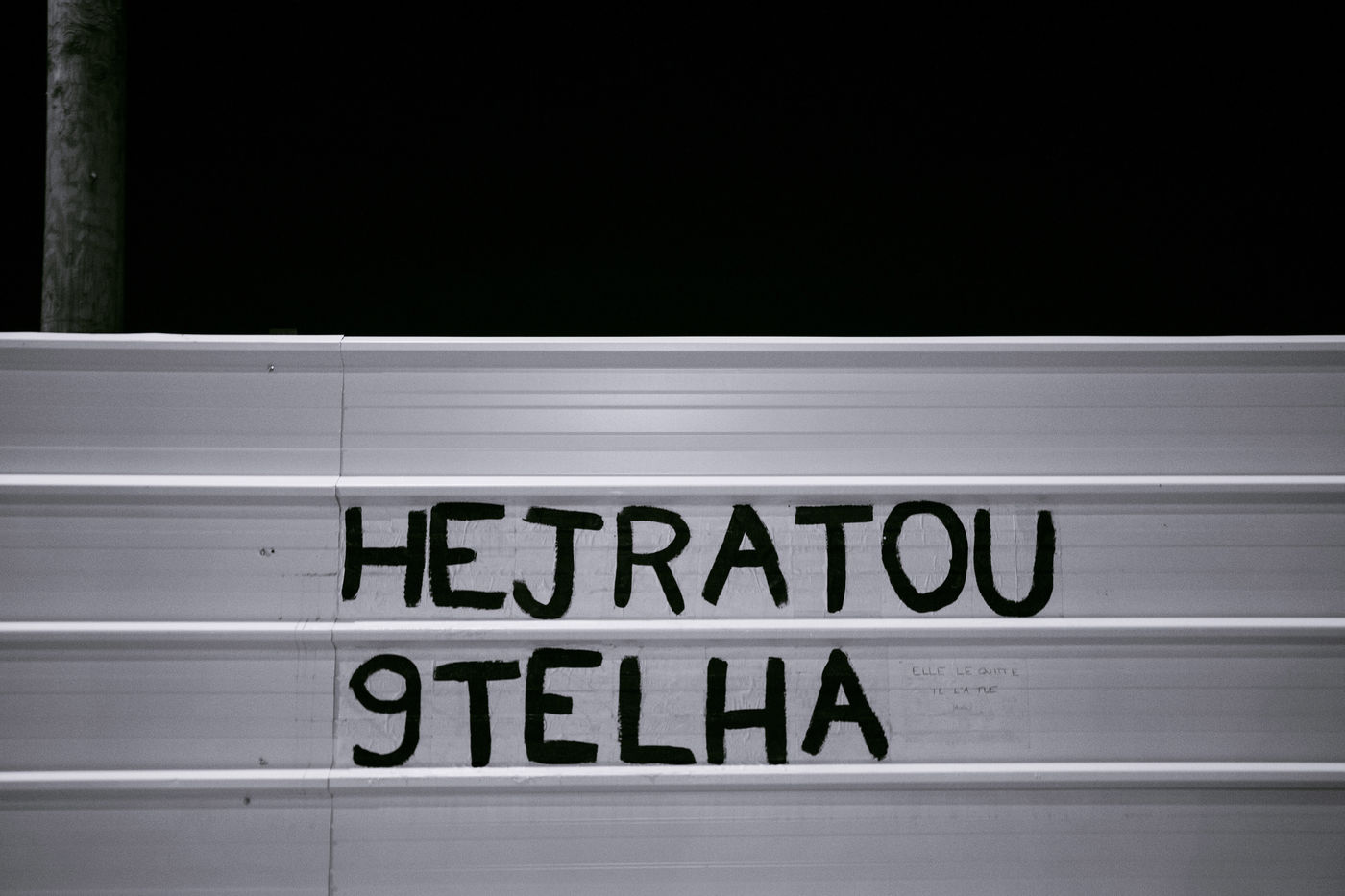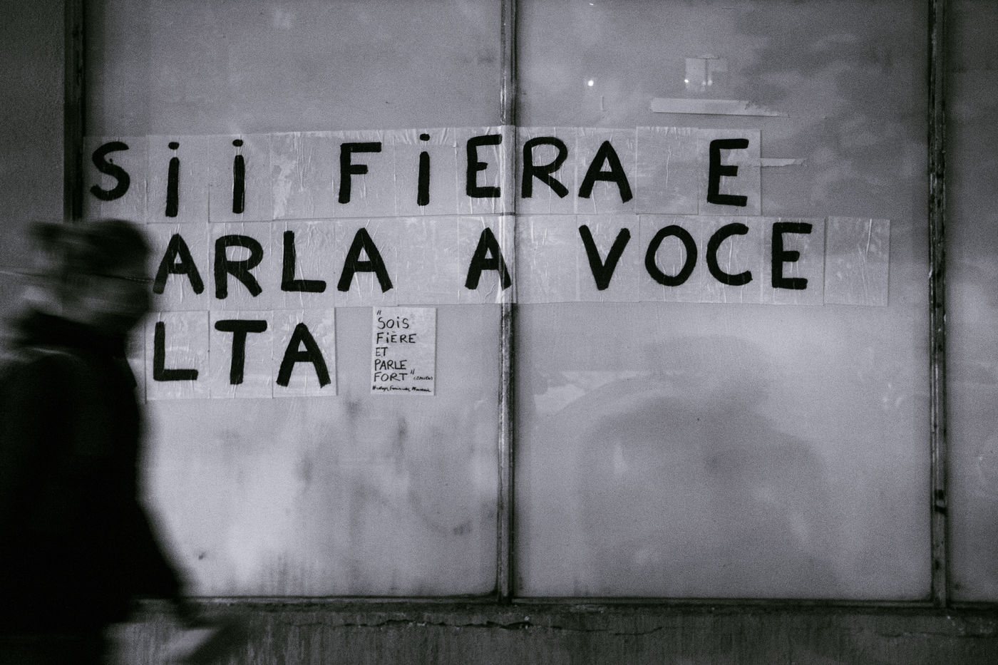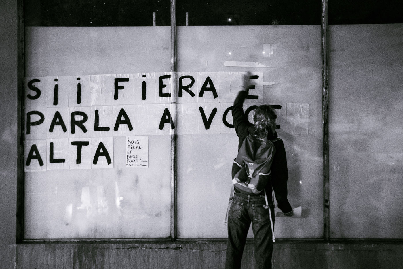 Session de collages contre les féminicides et contre les violences sexistes et sexuelles en plusieurs langues afin de rendre accessibles les slogans féministes.