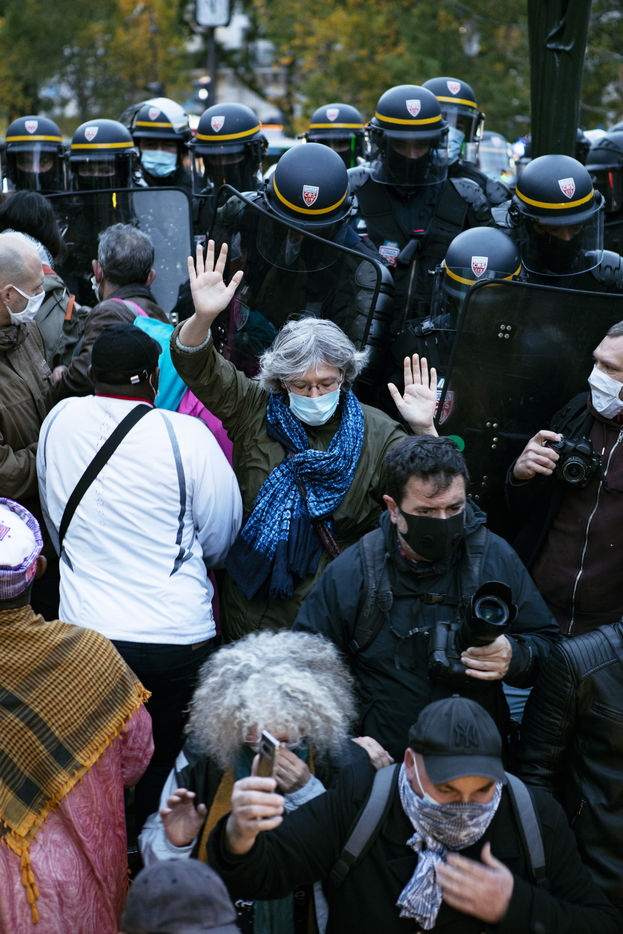 Aujourd'hui avait lieu un rassemblement pour protester contre le couvre-feu, son efficacité et ses effets liberticides. Ce rassemblement a été encerclé par les CRS et la BRAV. La police a menacé les manifestants en les encerclant et en les poussant dans le métro.
