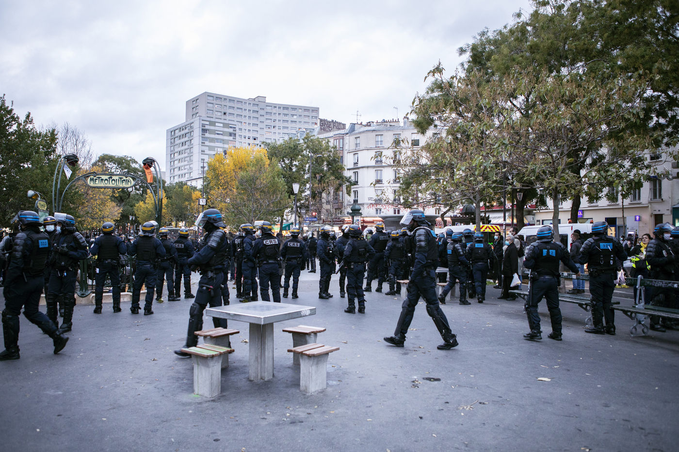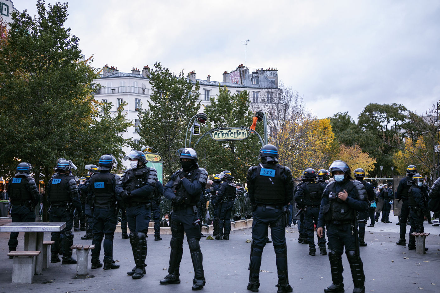 Today a rally was held to protest against the curfew, its effectiveness and its liberticidal effects. This rally was surrounded by the CRS and the BRAV. The police threatened the demonstrators by encircling them and pushing them into the subway.